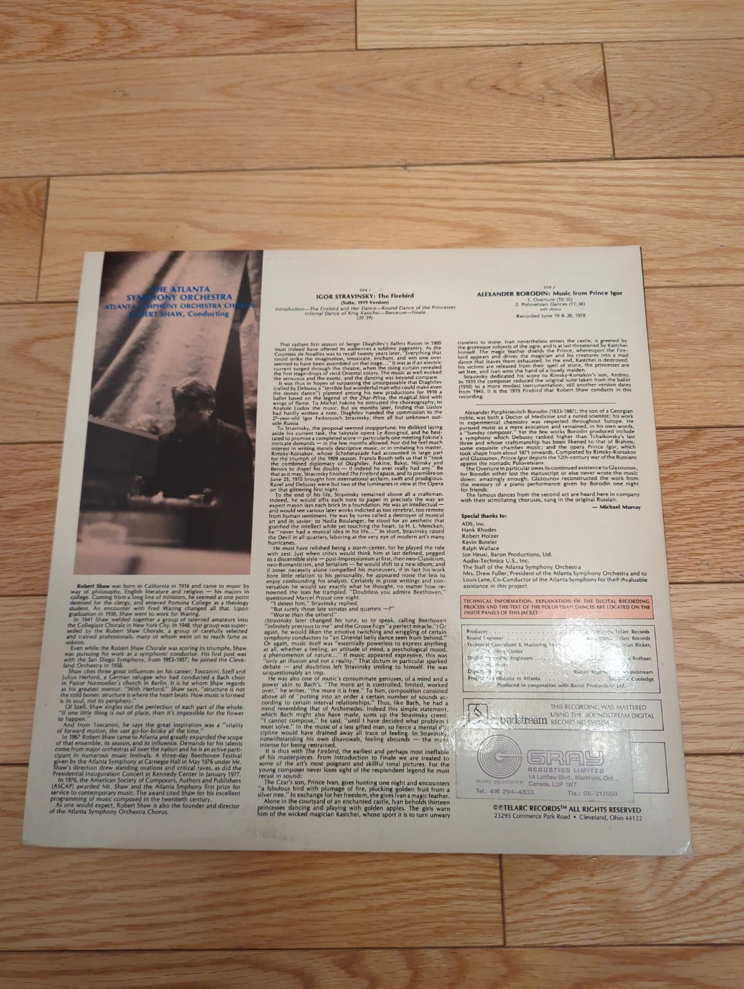 This is a vinyl record featuring Igor Stravinsky's 'The Firebird' and Borodin's 'Overture and Polovtsian Dances from Prince Igor'. The Atlanta Symphony Orchestra and Chorus, conducted by Robert Shaw, perform on this recording. It's a Telarc Digital recording. Includes original liner notes.