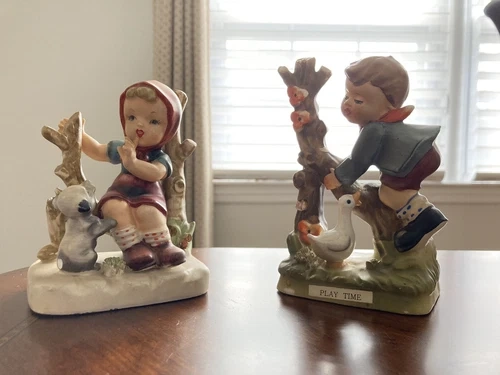 This lot includes two vintage porcelain figurines by Eric Stauffer, known for his attention to detail and quality craftsmanship. Playtime Boy & Girl with Puppy. These decorative pieces are perfect for any occasion and will add a touch of elegance to any space. The figurines are beautifully painted and feature intricate details that showcase Stauffer's artistic talent. Ideal for collectors or those looking to add a unique touch to their decor, these figurines are sure to impress.