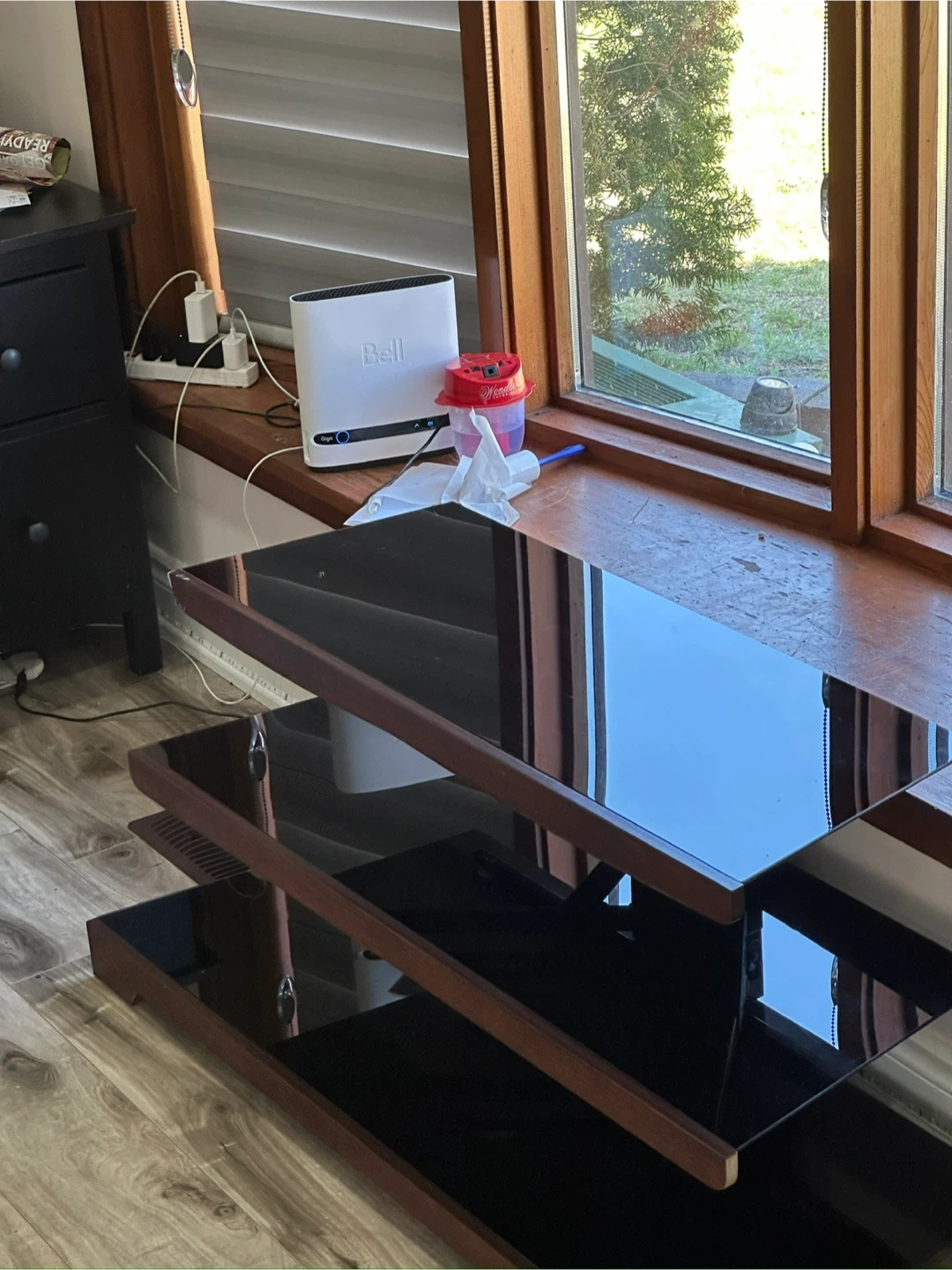 A 3-tier TV stand featuring a dark wood frame and sleek black glass shelves. It's designed to hold your media components and can accommodate most televisions. This stand would be useful for organizing electronics in a living room or entertainment space. 🥕