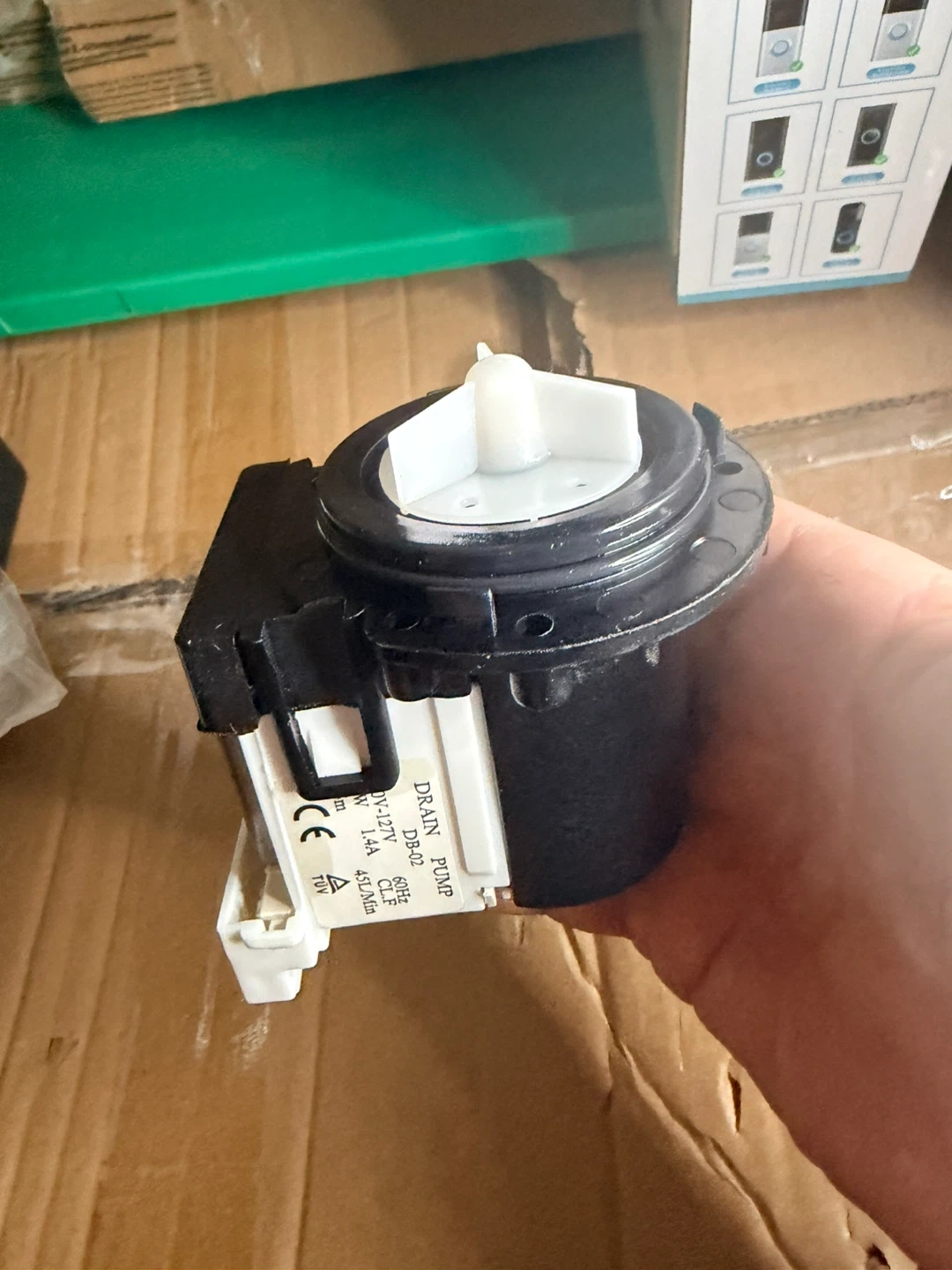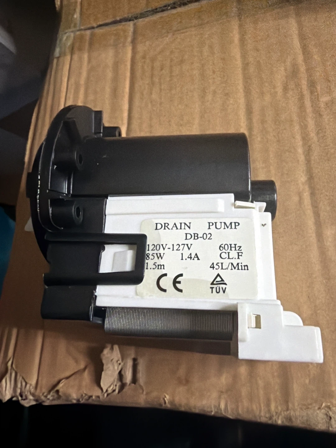 This is a drain pump, model DB-02. It runs on 120V-127V at 85W and 1.4A. It has a flow rate of 45L/min. This pump is suitable for appliances needing a reliable drainage solution.
