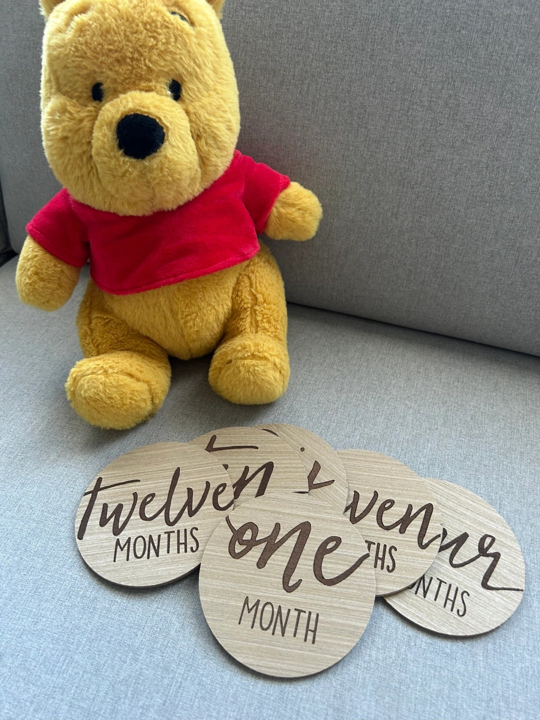 Set of wooden milestone discs to track your baby's growth each month! Includes discs for months one through twelve. Great for photos and creating memories