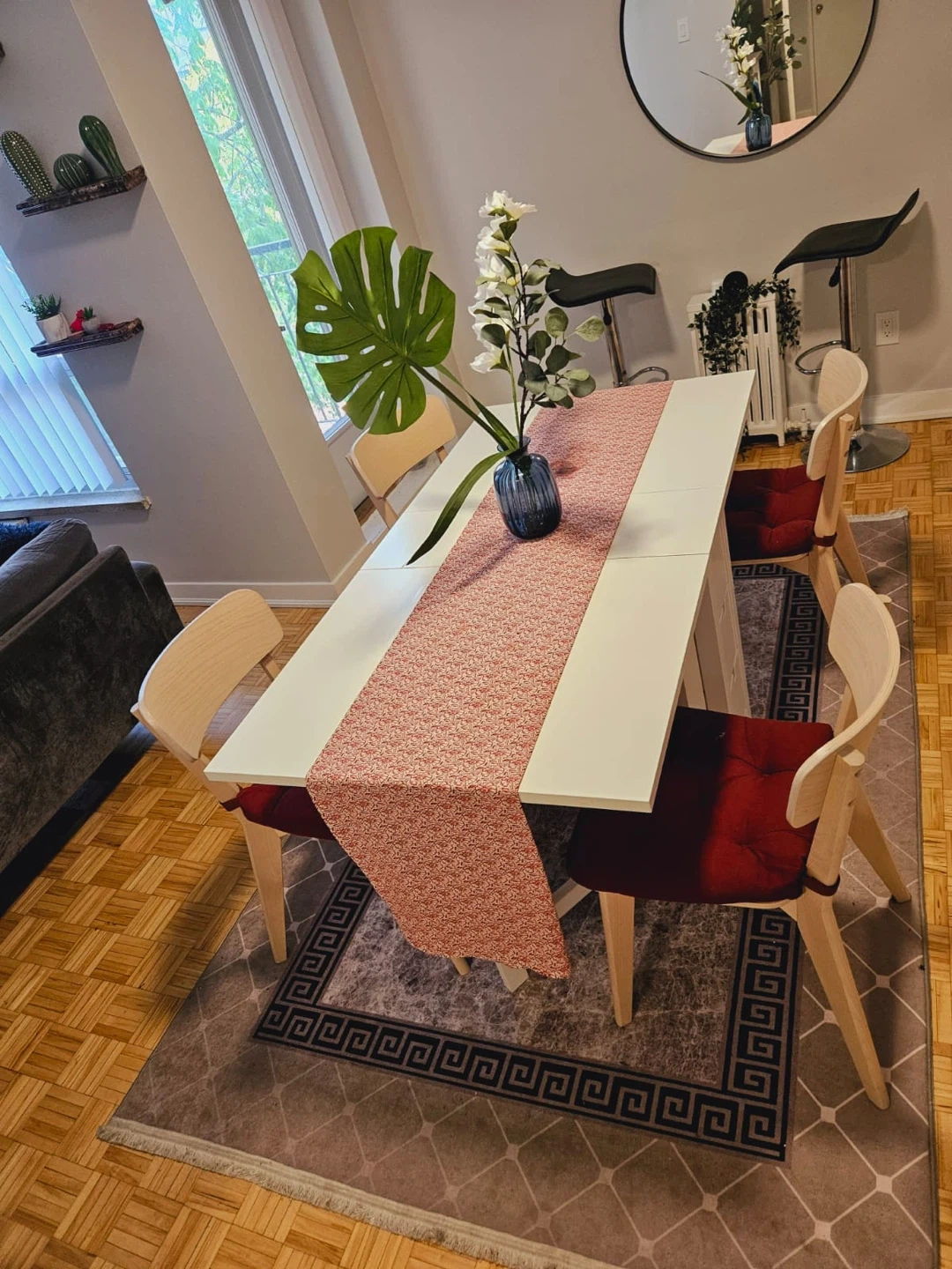 White extendable dining table. Seats up to six people when extended. It's made with a sturdy base and a smooth, easy-to-clean surface. This table's perfect for smaller dining spaces that need occasional extra room!