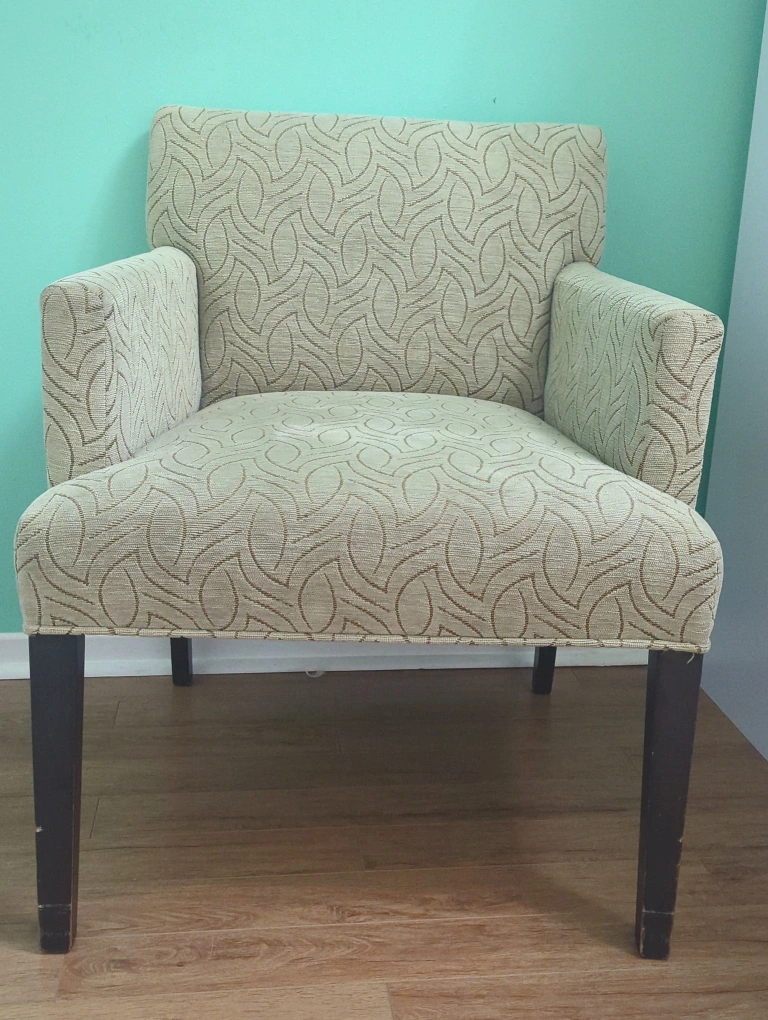 Comfortable armchair featuring a beige patterned fabric. The chair has a classic design with sturdy dark wood legs. Perfect for adding a touch of elegance to any living space. There are some signs of wear on the legs.