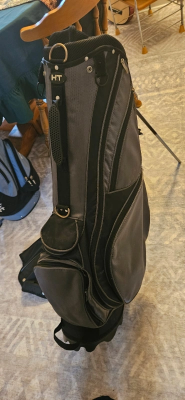 30Selling a used HT golf stand bag in black and grey. It's in good condition and ready for the golf course! Features include multiple pockets for storage and a stand for easy access to your clubs. Perfect for any golfer looking for a reliable and functional bag