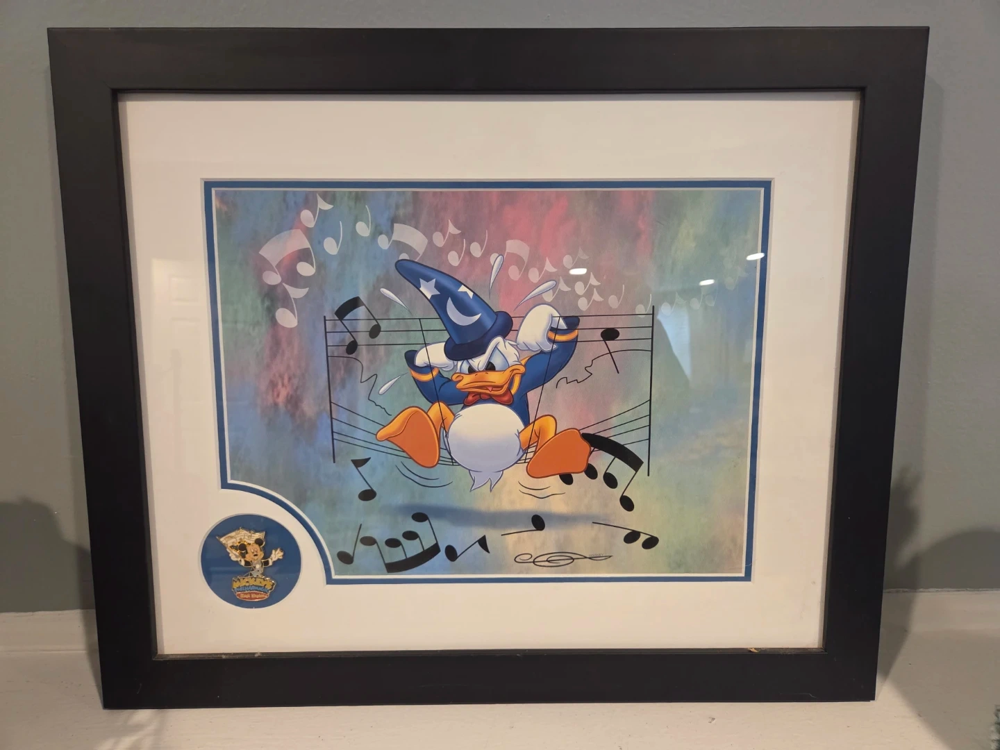This Disney framed pin features Donald Duck dressed as the Sorcerer's Apprentice from Fantasia.