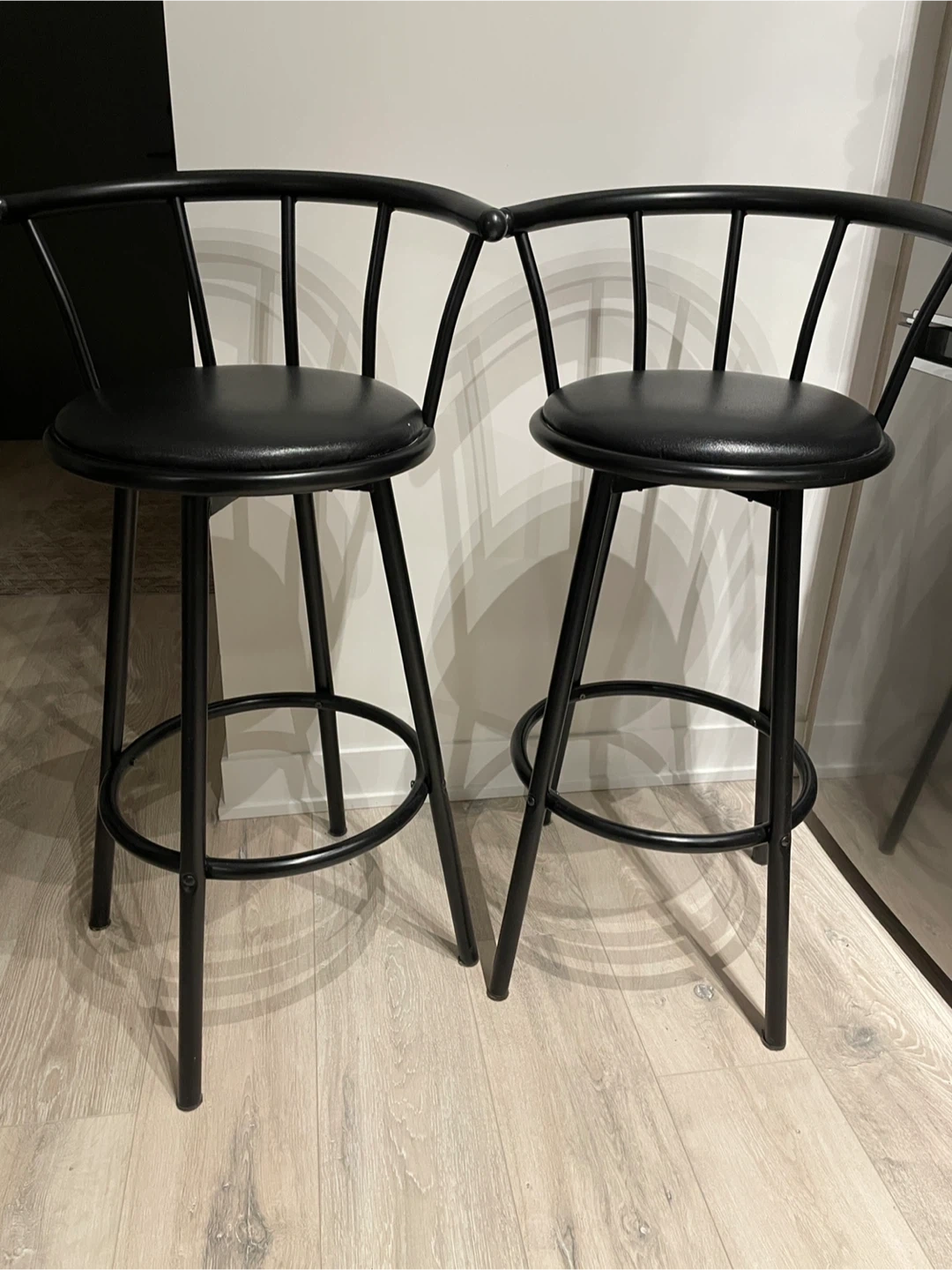 Selling a set of two black bar stools. They're in great shape and would look great in any kitchen or bar area. The stools have a comfortable seat and a sturdy rotating base. Perfect for adding extra seating to your space!