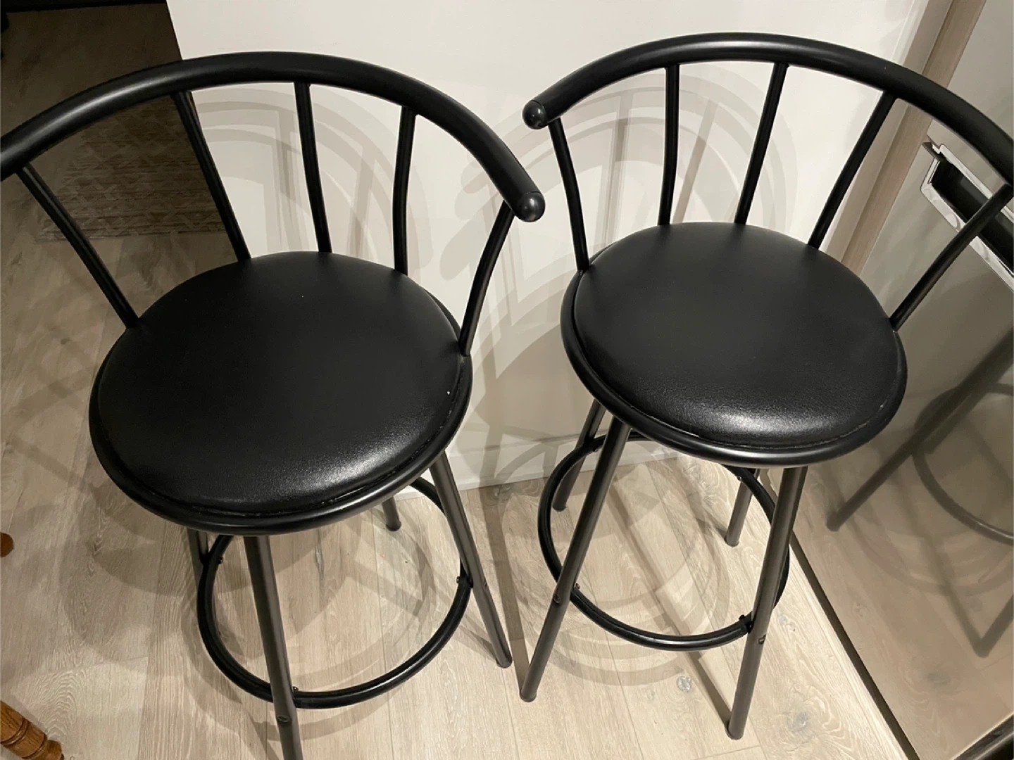 Selling a set of two black bar stools. They're in great shape and would look great in any kitchen or bar area. The stools have a comfortable seat and a sturdy rotating base. Perfect for adding extra seating to your space!