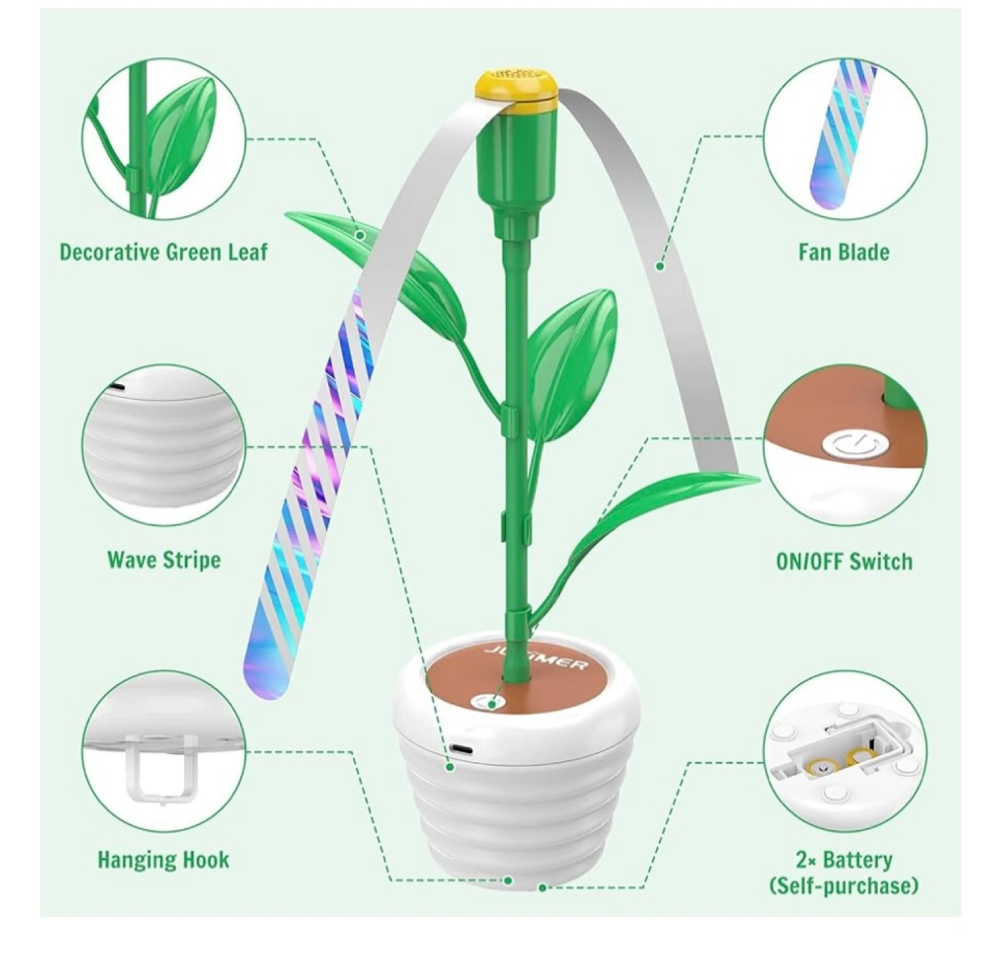 Each pot comes with placable leaves, soft fan blade and USB cord.