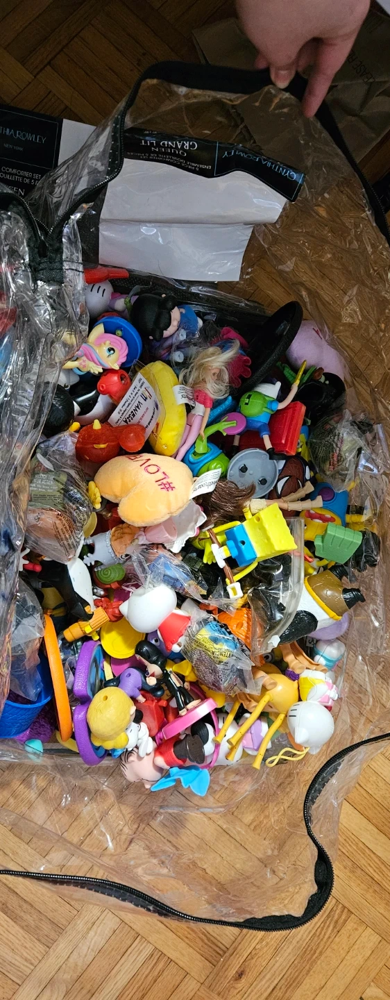 I have a large bag filled with various toys! There's a mix of different characters and items inside. Perfect for playtime or adding to a collection