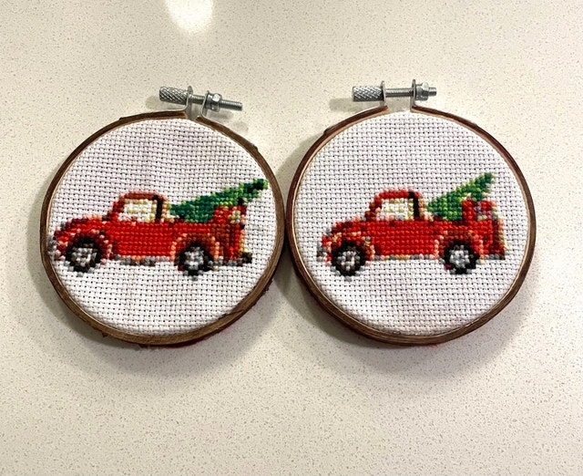 Embroidered/Cross stitched by me. Features a bamboo hoop, and is 3 and a half inches wide and 4 inches tall. Can be framed or hung on the Christmas tree, or anywhere your heart desires. $15/each, or both for $25.