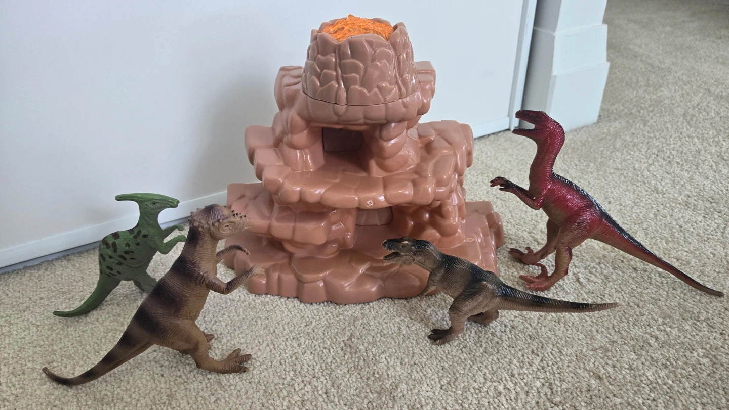 This is a fun dinosaur volcano playset. It includes a large volcano structure and four assorted dinosaur figures. The volcano has openings for imaginative play.