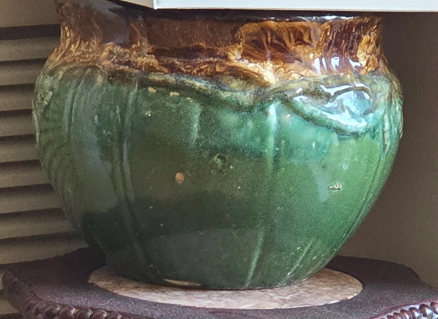 A decorative ceramic pot with a green glazed body and a brown speckled rim. It's suitable for holding plants or as a standalone decorative piece. Ceramic material.