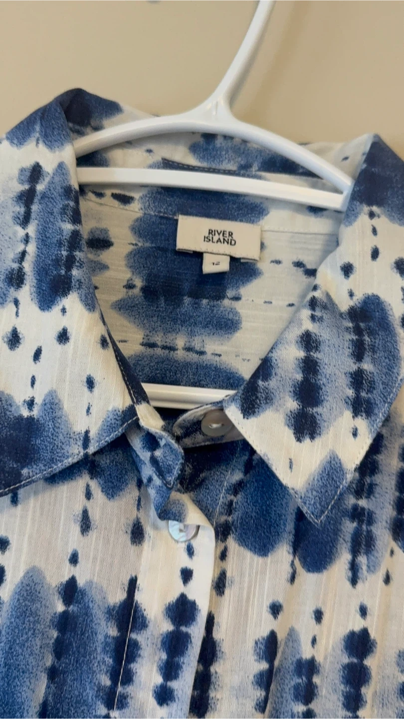 Looking to sell a River Island button-up shirt. It features a stylish blue and white tie-dye pattern. The shirt is a size 12. Perfect for adding a unique touch to your wardrobe!