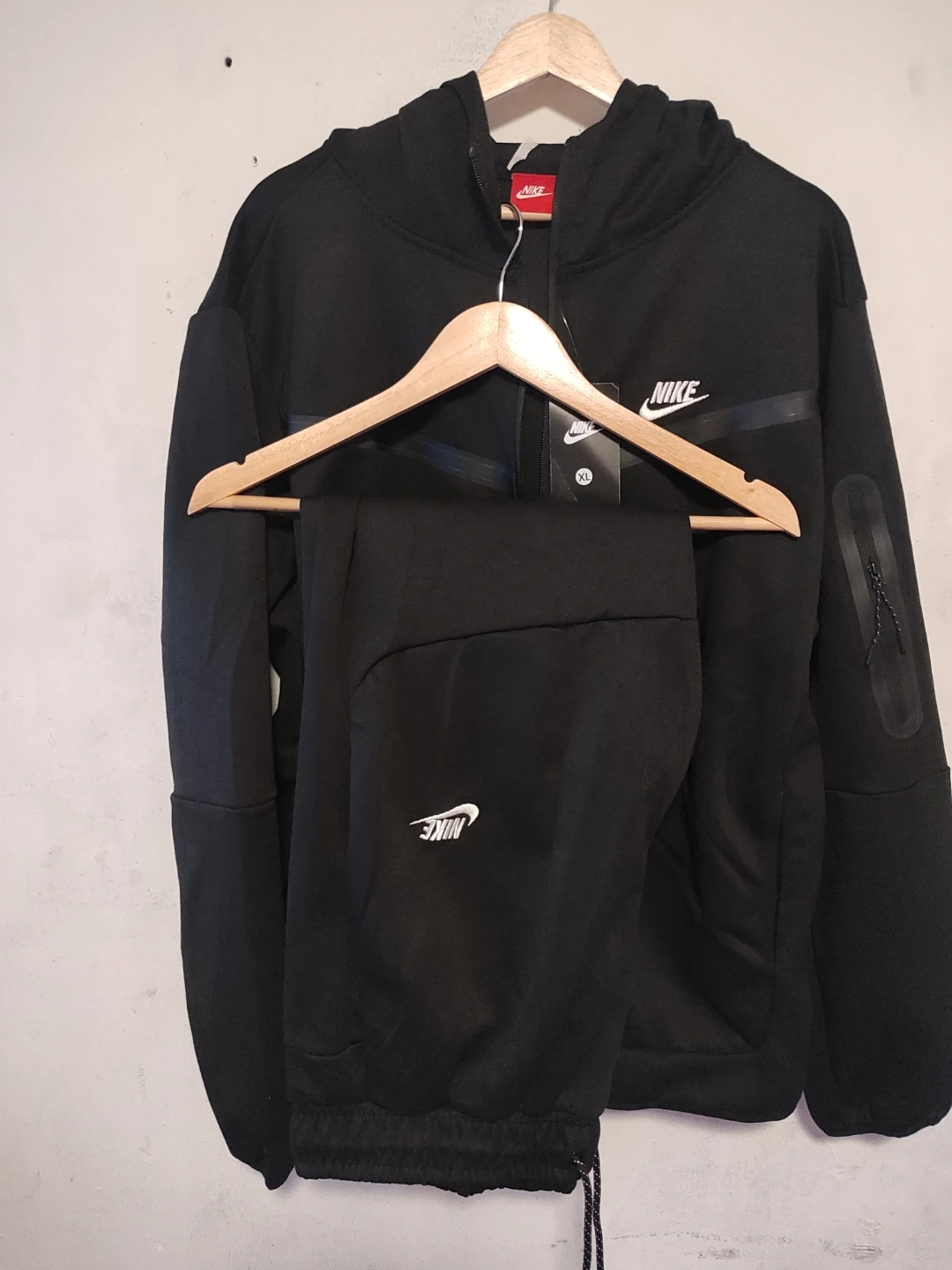 This is a black Nike Tech Fleece full zip hoodie and matching pants set. It's size XL and features the signature Nike swoosh. Made from a soft and durable blend, it's built for comfort. Ideal for casual wear or athletic activities!