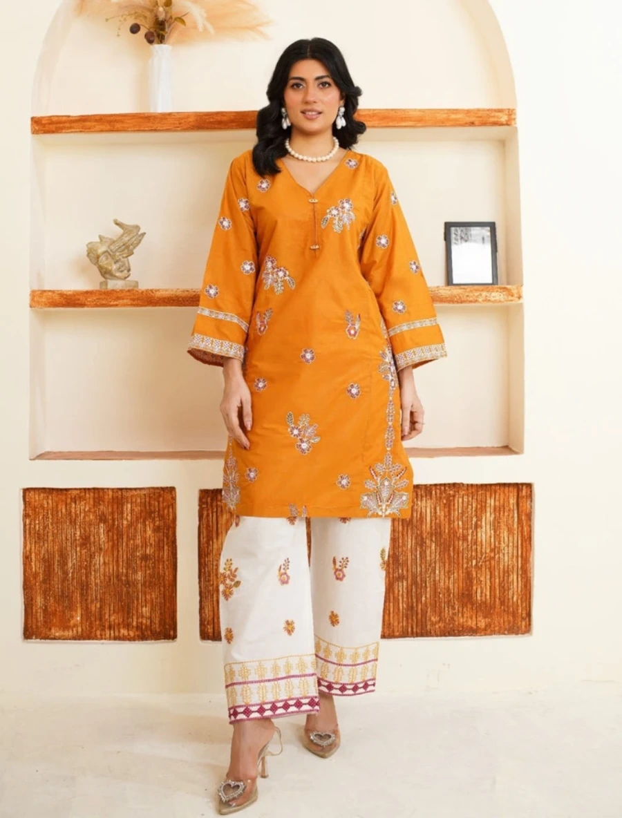 This is a lovely two-piece outfit featuring an orange kurti with intricate embroidery and matching white pants. The kurti has a a gorgeous embroidery while the pants are adorned with a complementary embroidered hem. It's a stylish choice for casual or festive occasions.