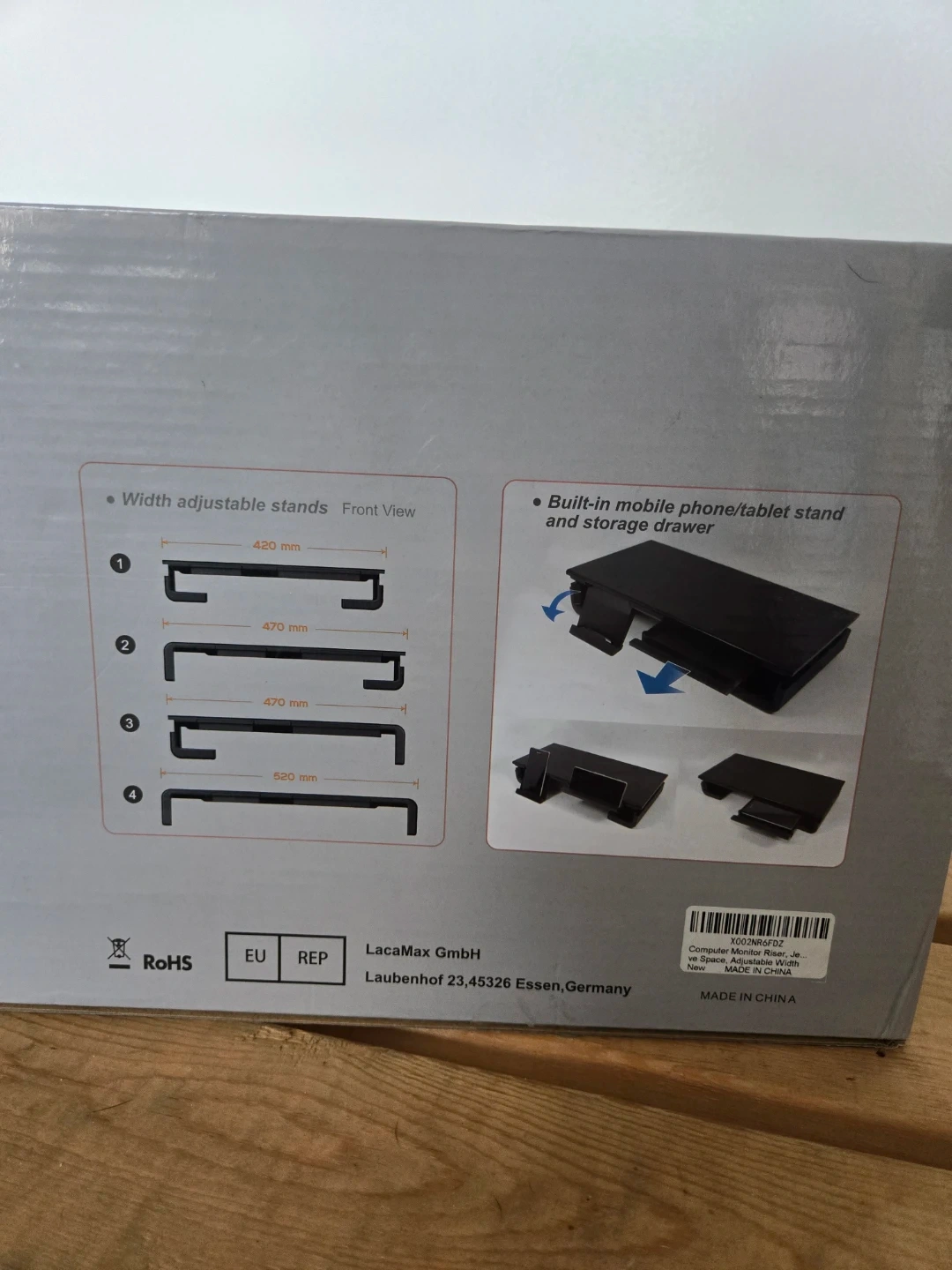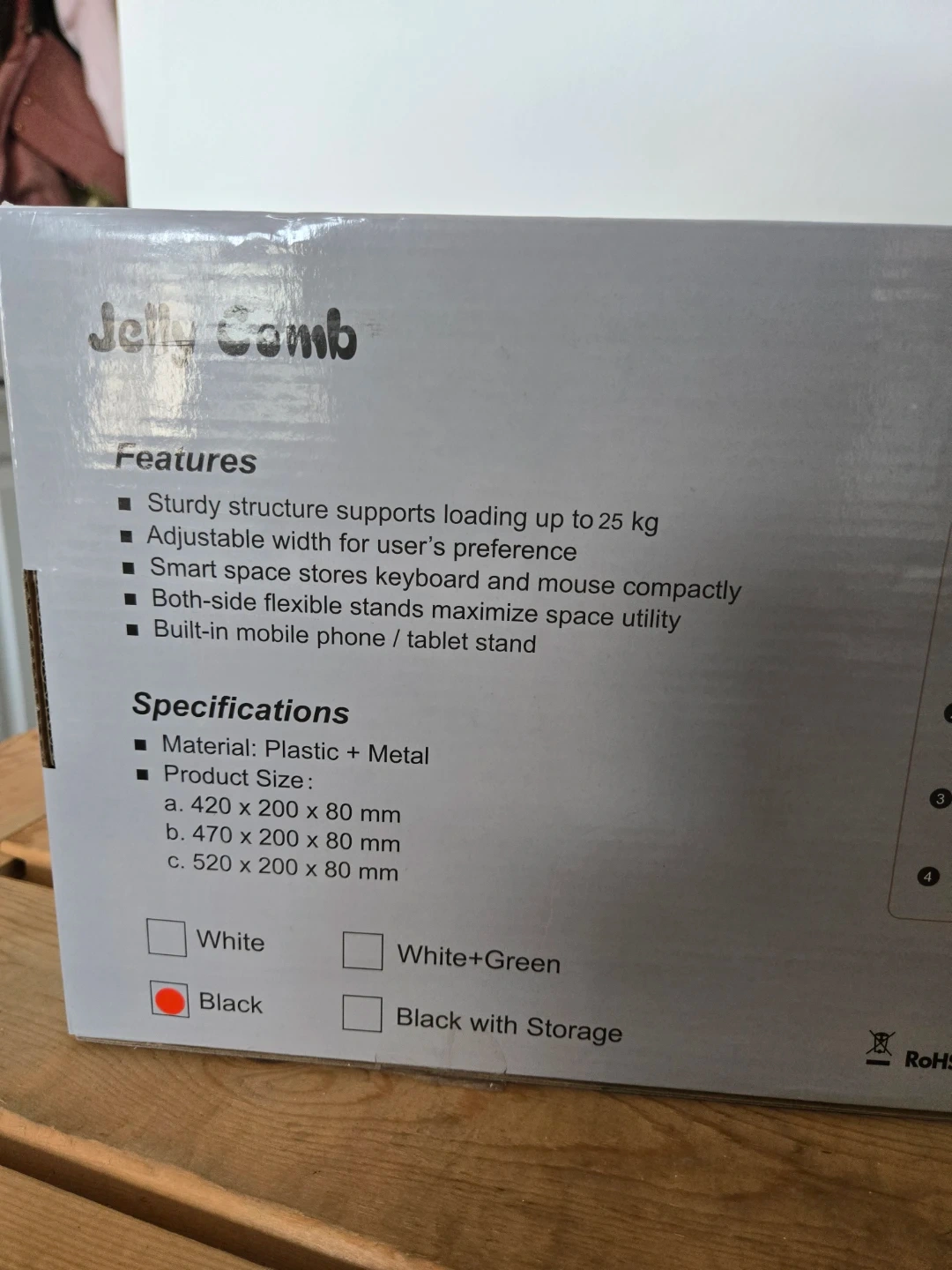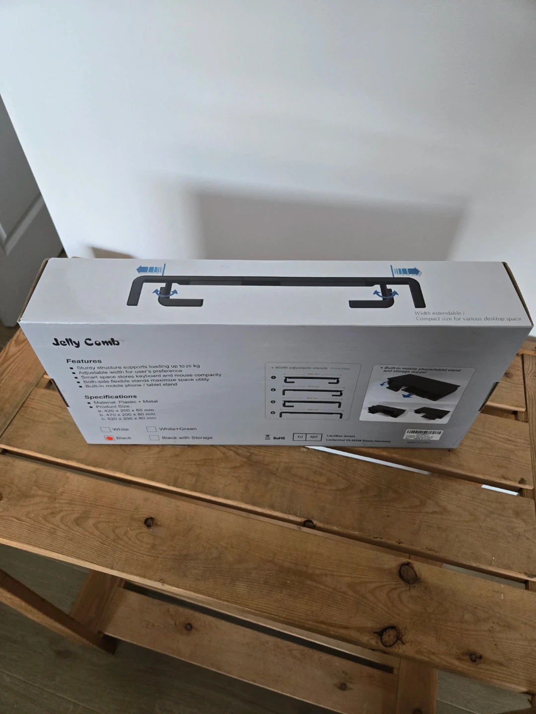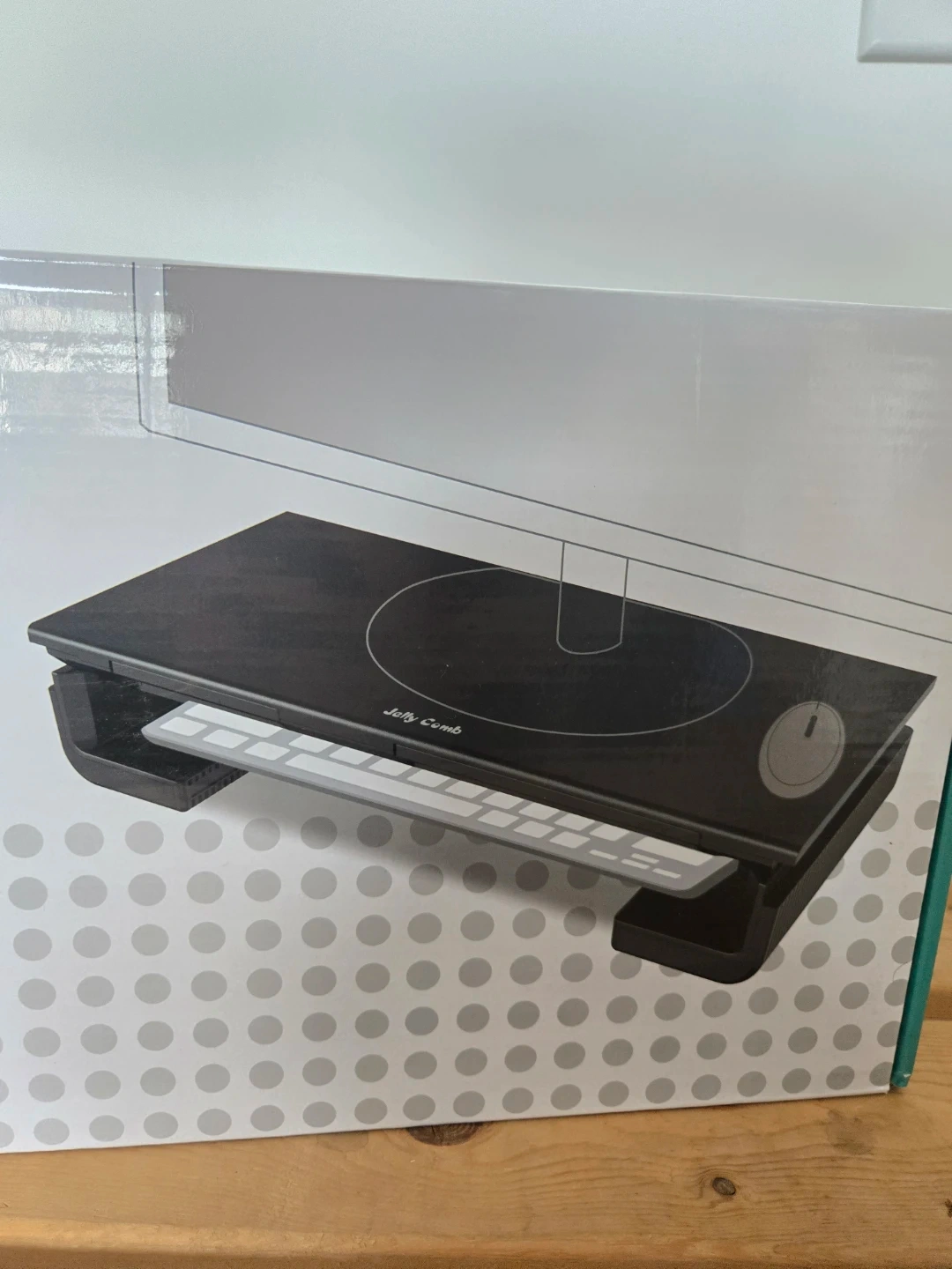 This Jelly Comb monitor stand has a metal construction and supports loading up to 25 kg. It features a built-in mobile phone/tablet stand and storage drawer. Dimensions are 380 x 200 x 80 mm. Perfect for organizing your desktop space!