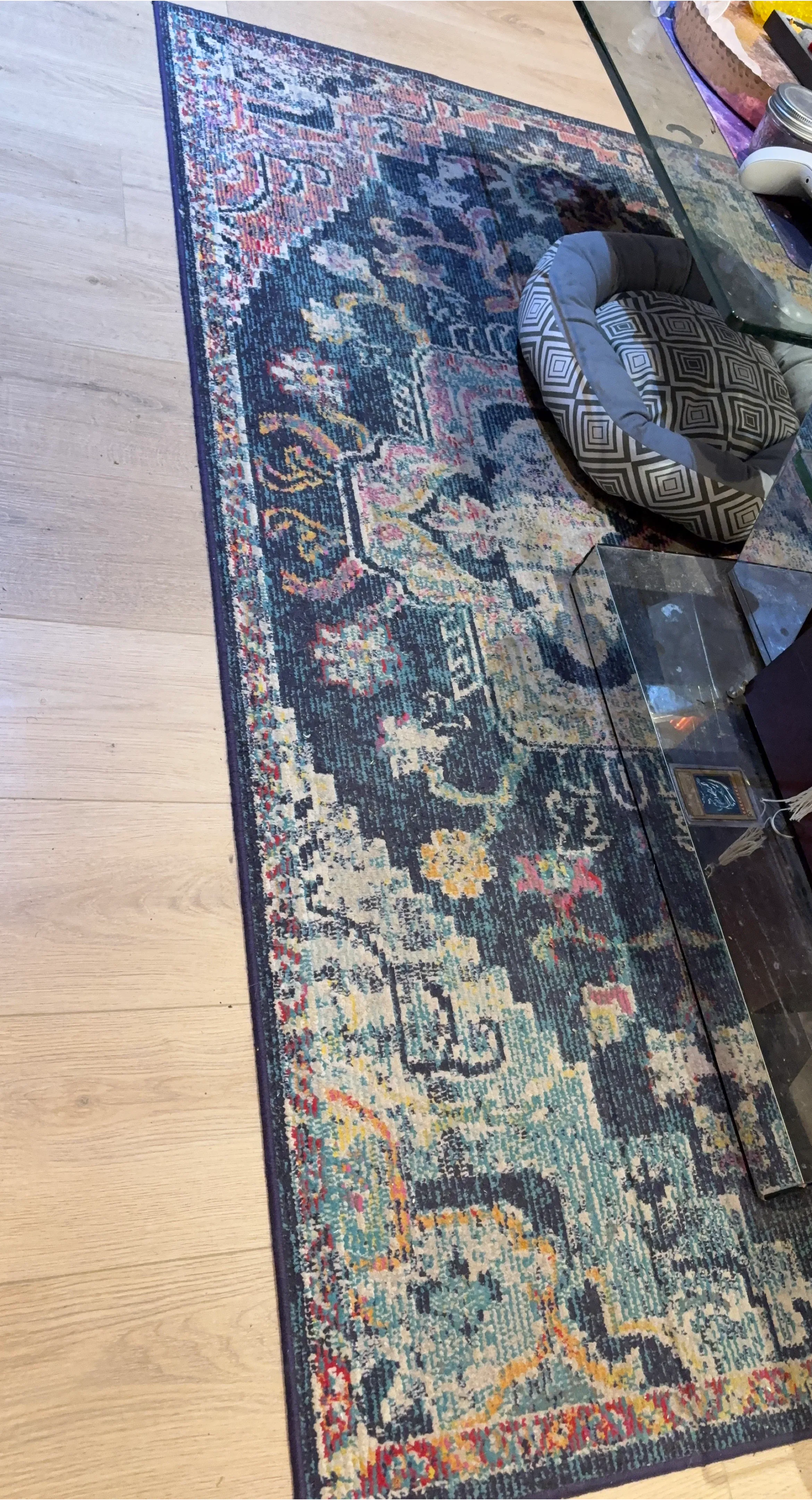 Persian-style area rug with a distressed dark blue, red, and teal pattern. It's a nice size for a living room or entryway. Adds a touch of warmth to any space! Comes from a clean and pet friendly home.