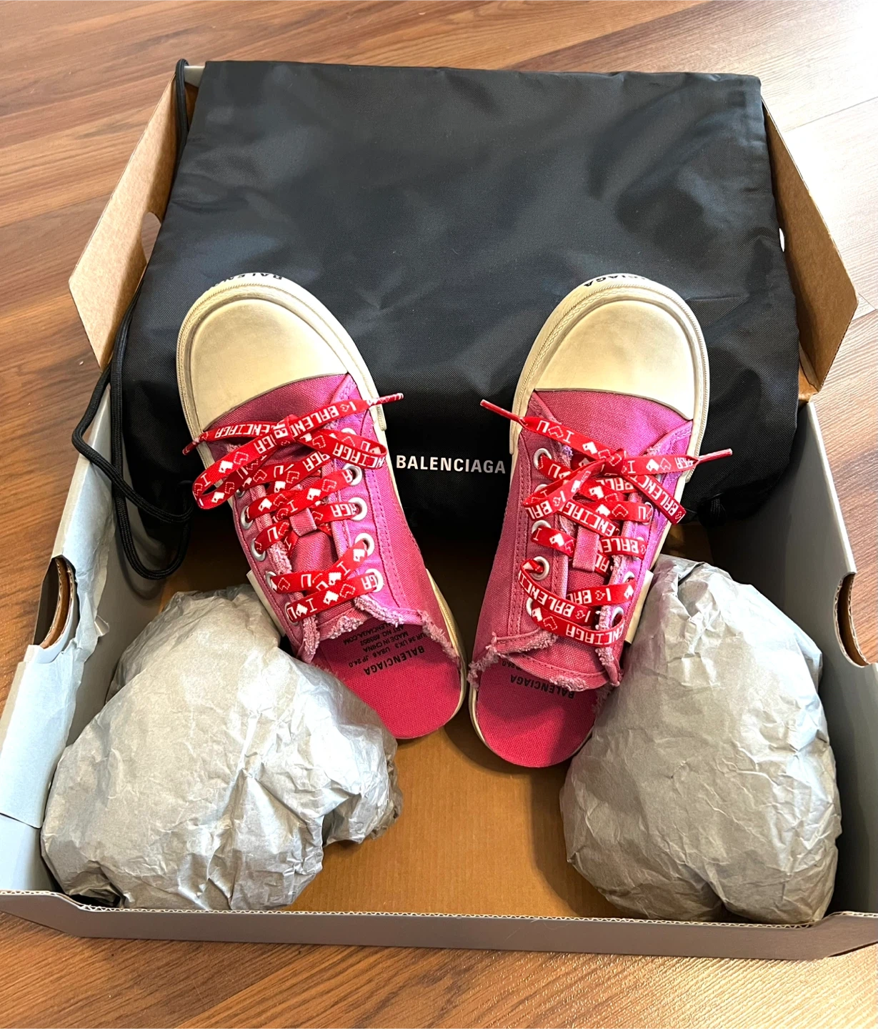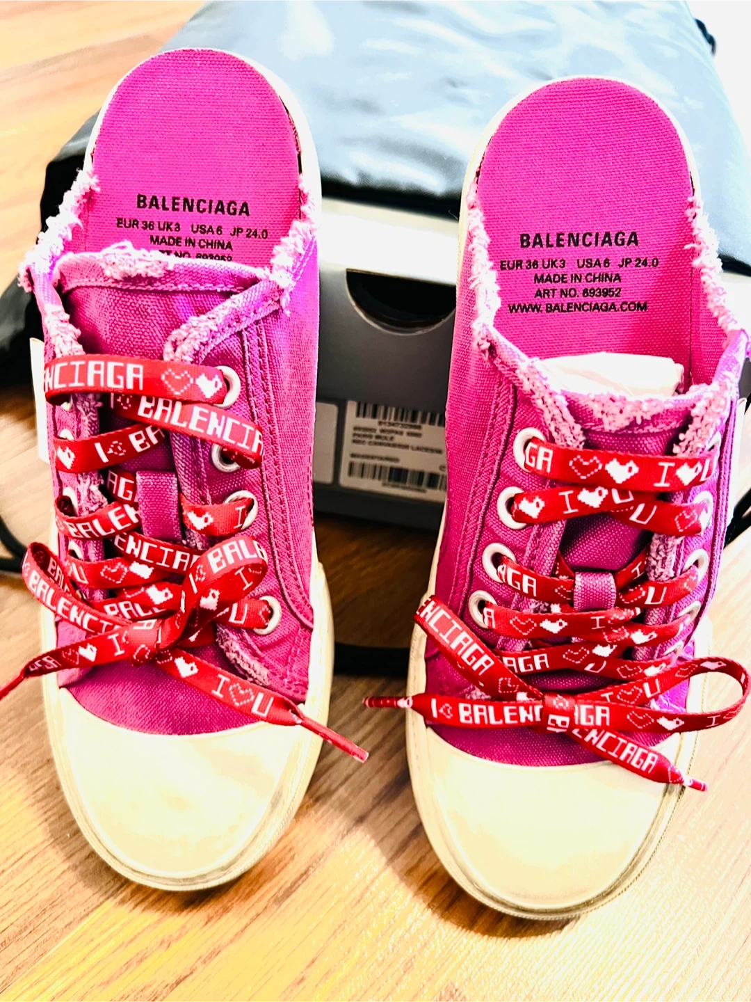 Authentic Balenciaga magenta canvas sneakers/mules with Paris Mule design. Features red laces with "I love Balenciaga" laces and heart print. Size is 36 EU (3 UK, 6 US).