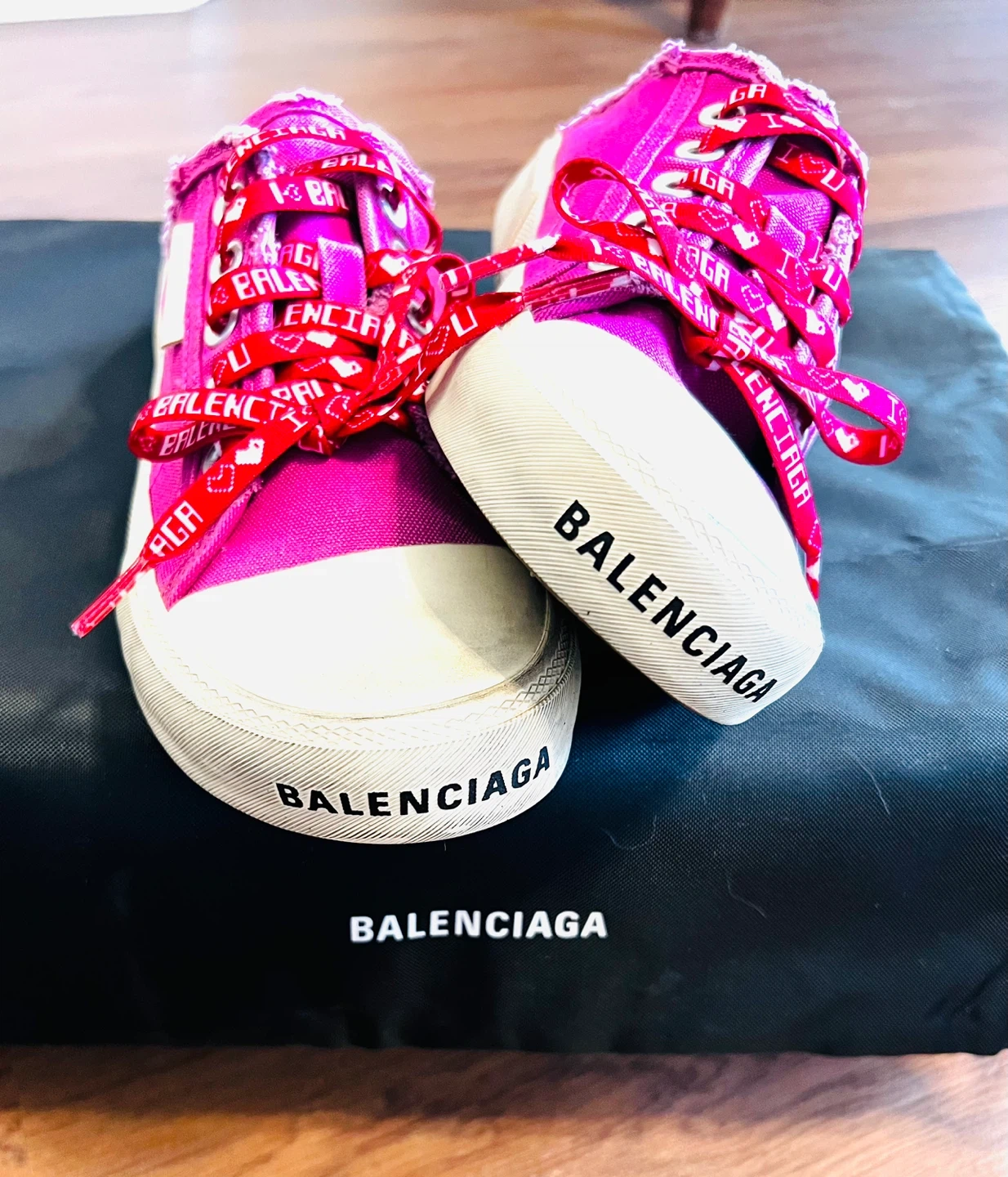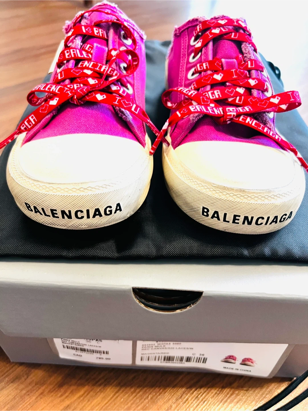 Authentic Balenciaga magenta canvas sneakers/mules with Paris Mule design. Features red laces with "I love Balenciaga" laces and heart print. Size is 36 EU (3 UK, 6 US).