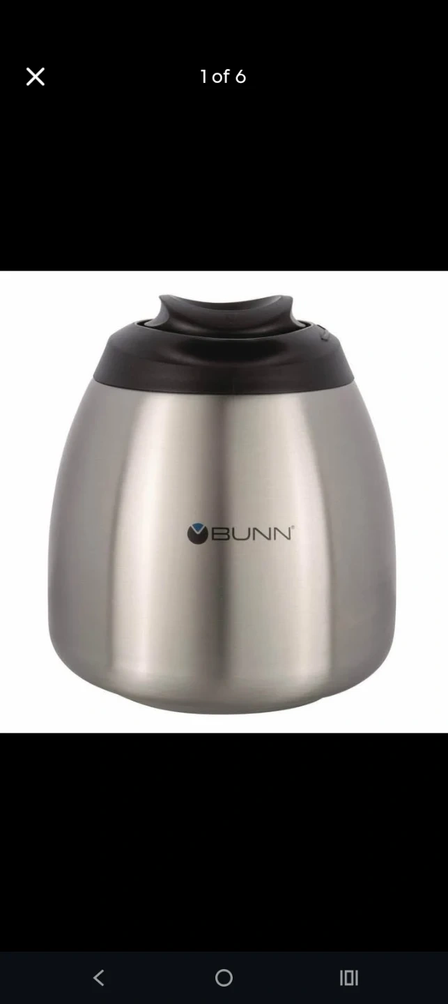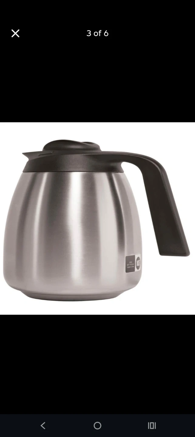 This Bunn coffee carafe is made of stainless steel with a black lid and handle. It's designed to keep your coffee warm. The NSF certification indicates it meets public health and safety standards.