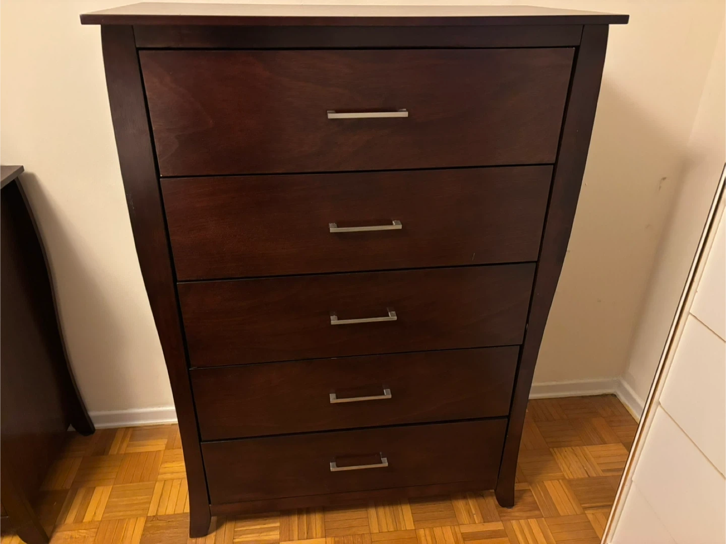 5 drawer wood espresso colour dresser. In excellent condition. Dimensions are as follows: