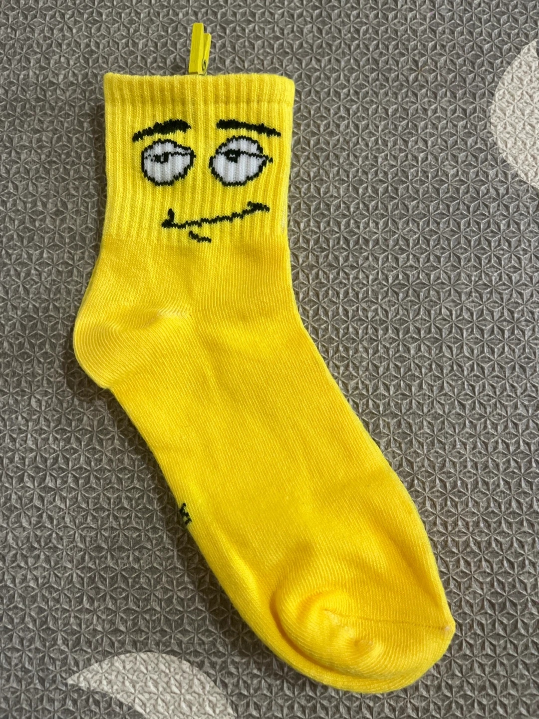 These yellow crew socks feature a fun, silly face design. They're made of a comfortable, ribbed knit material. One size fits most.