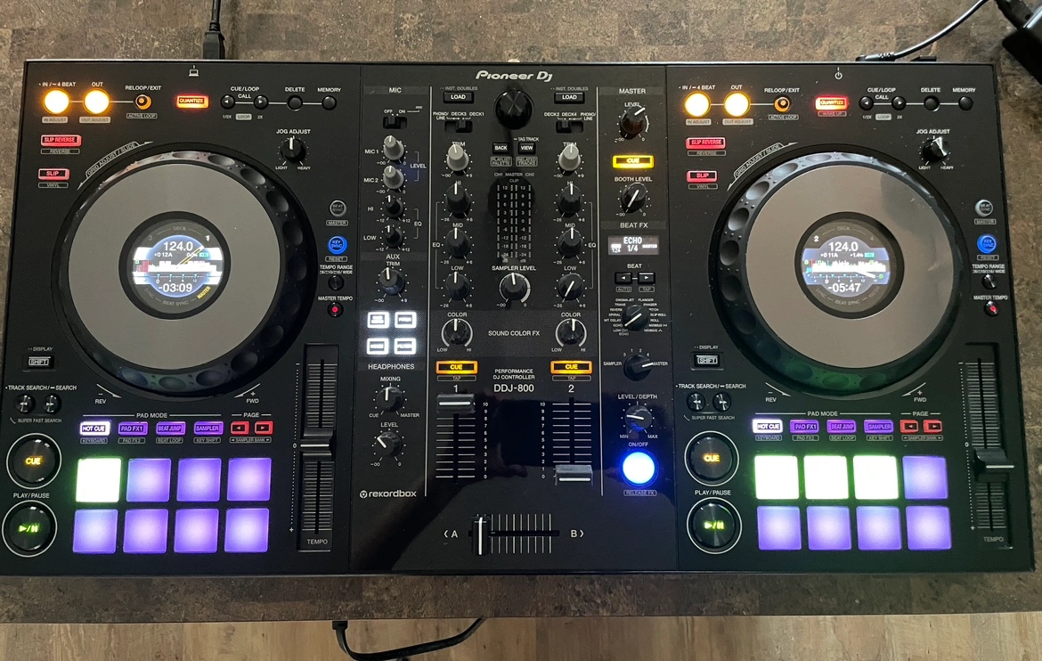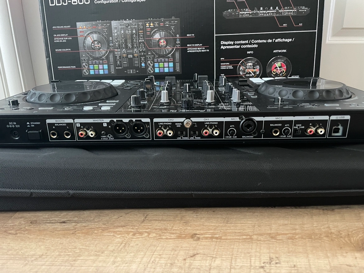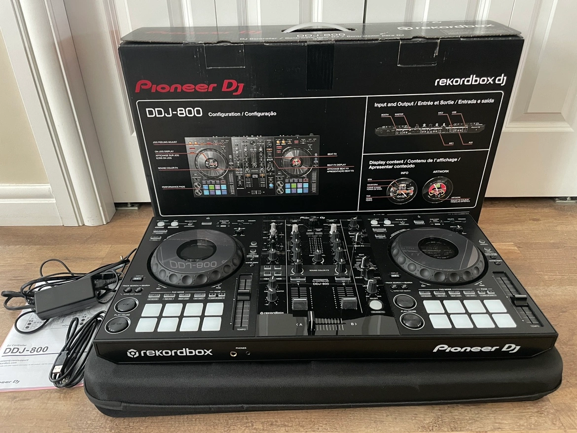Selling my DDJ-800 controller which comes with box, usb cable, charging cable, and additional carry case.
