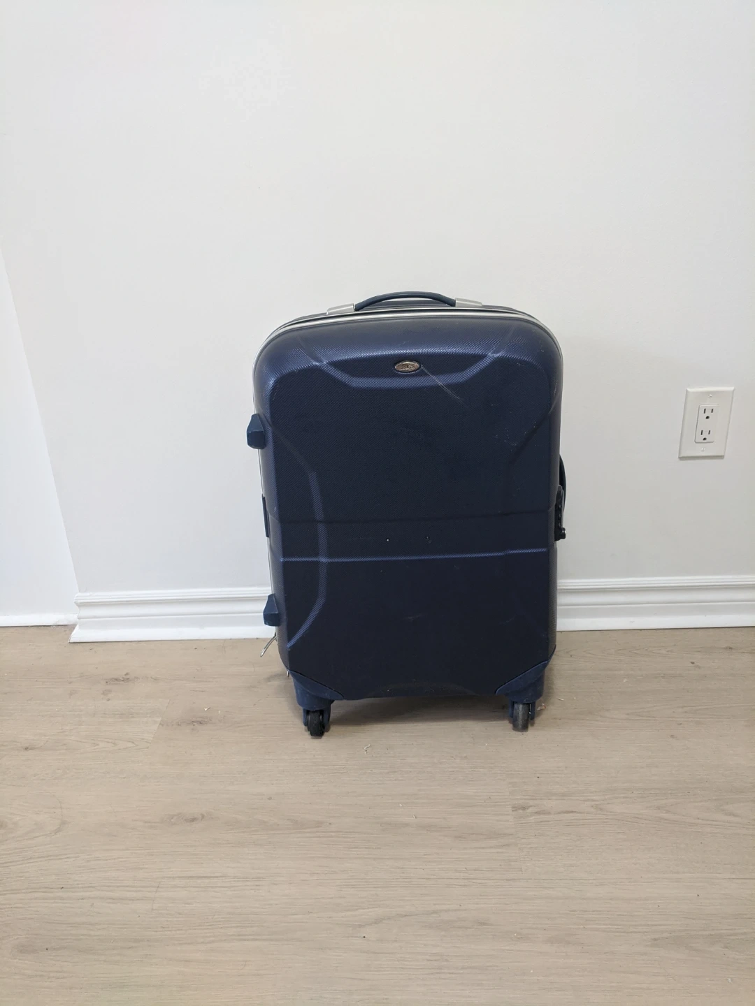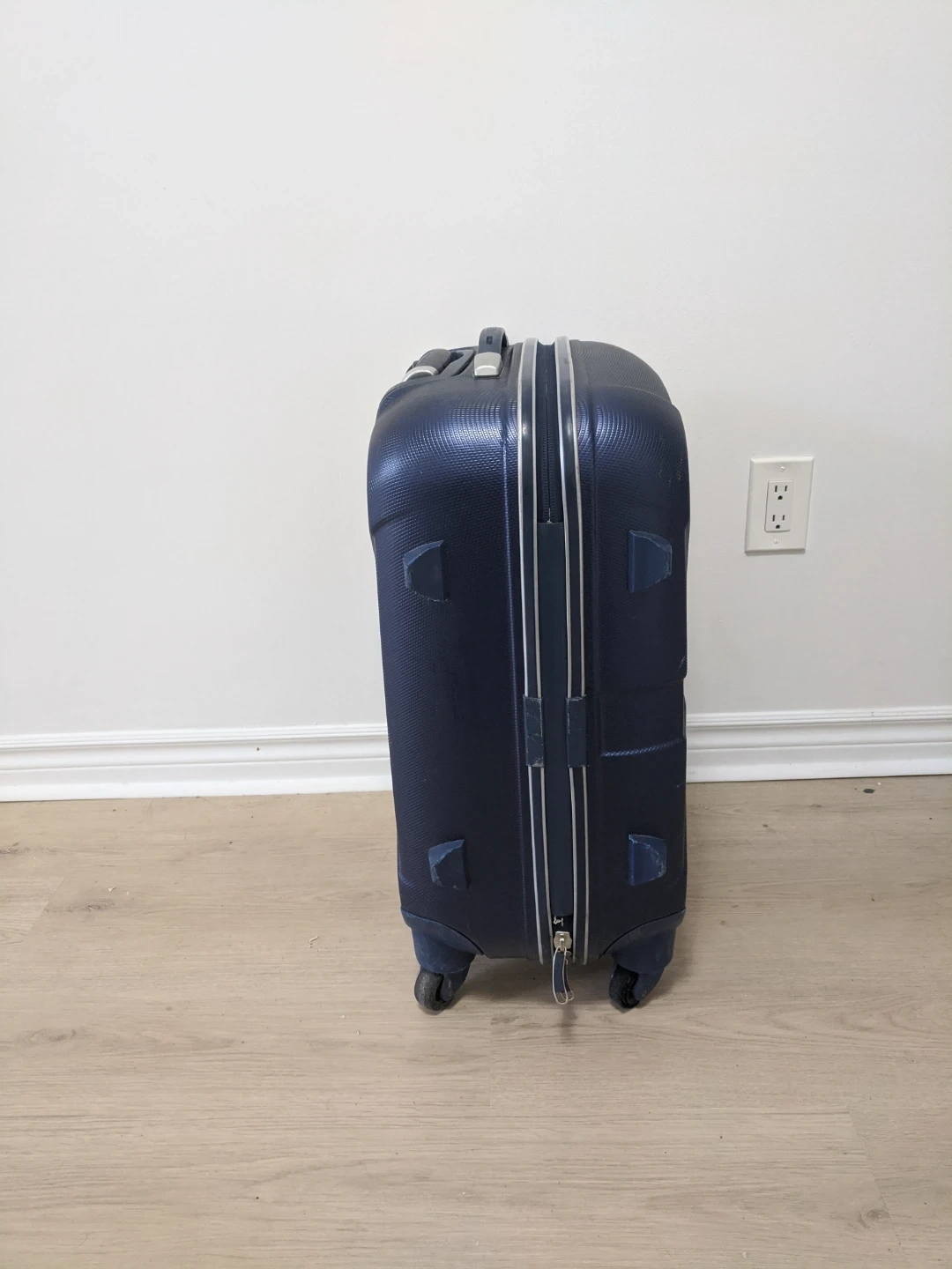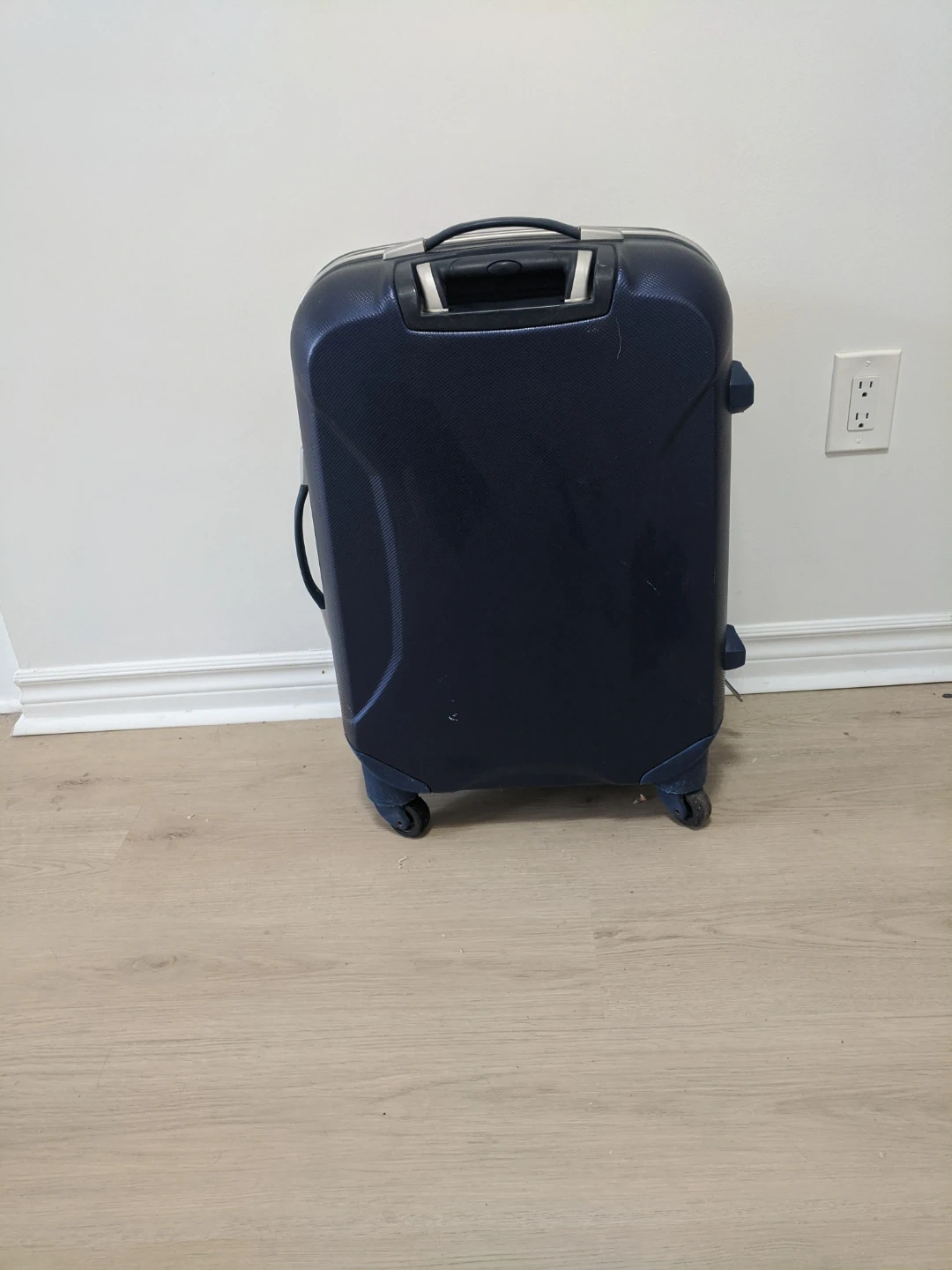 This navy blue hardside spinner luggage is great for travel. It's a carry-on size with a telescopic handle and four spinner wheels for easy manoeuvring. The interior has elastic straps to secure belongings. Pick up at 195 Merton Street Toronto or pick up at subway station Davisvill. And I can deliver it to your house but you need to pay me another $3. Thanks.