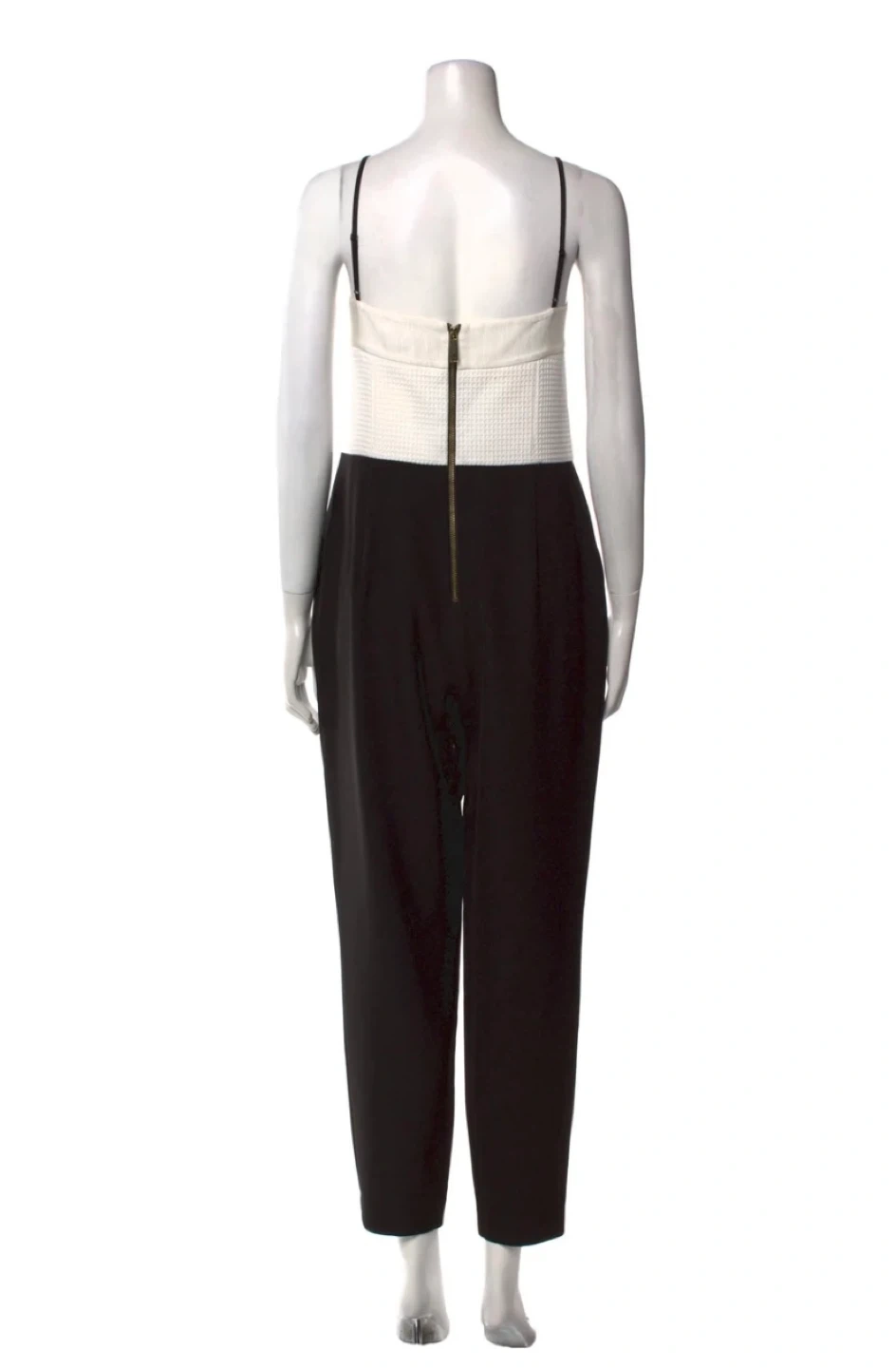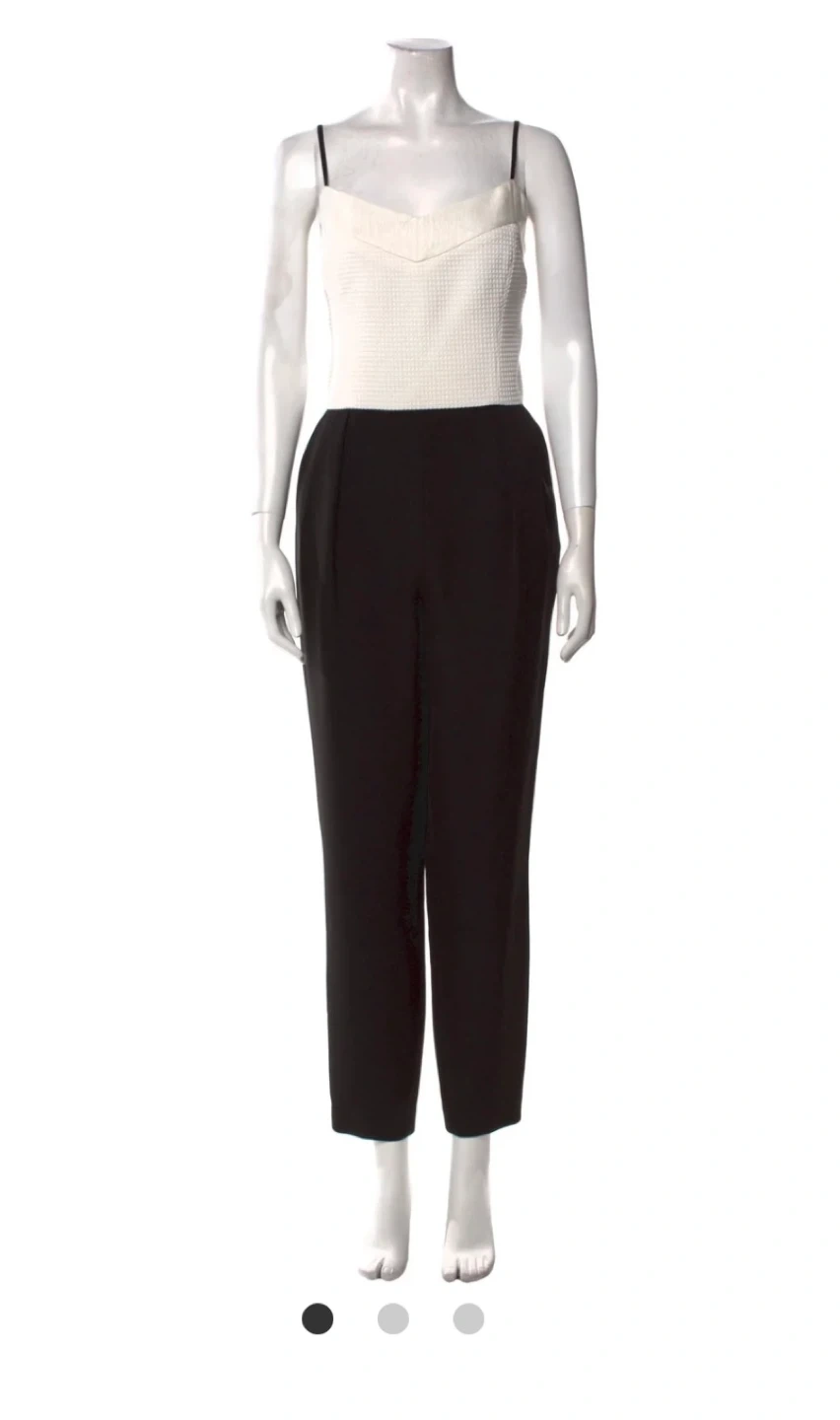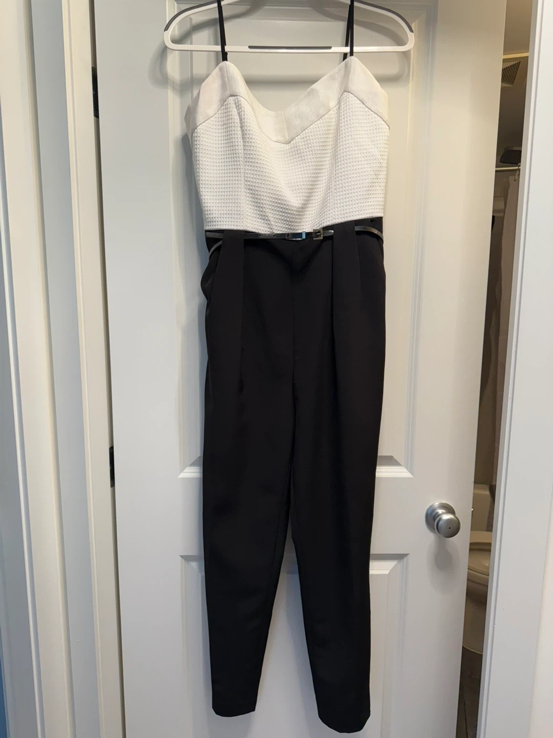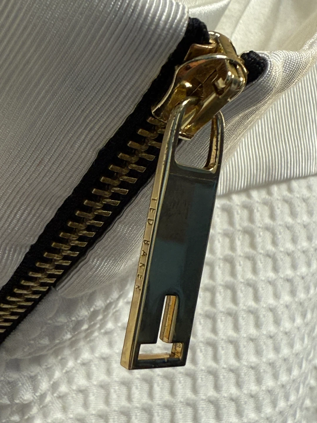 Selling a Ted Baker jumpsuit in a classic black and white colour combination! It features a stylish design that would be great for a night out or a special occasion. The white waffle material and the gold hardware accents makes for a sophisticated look and feel. This piece has only been worn once