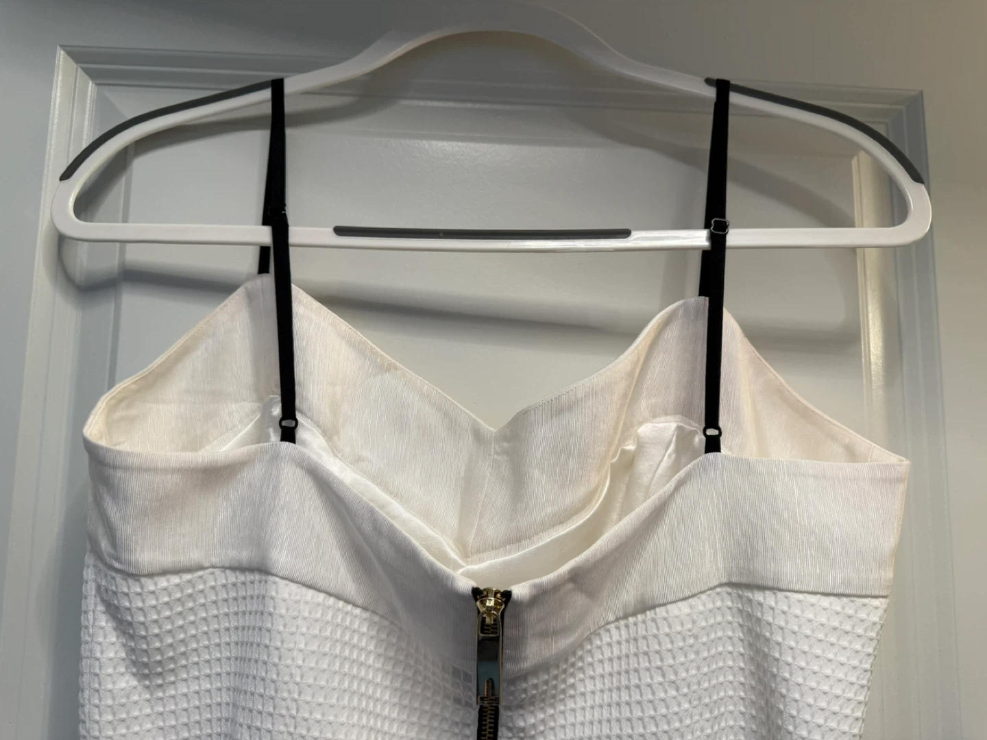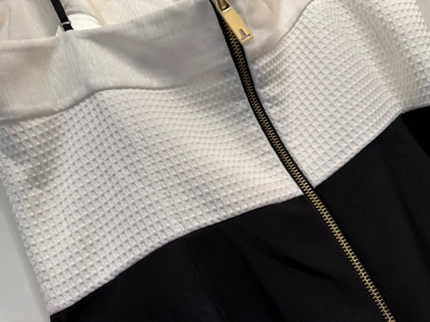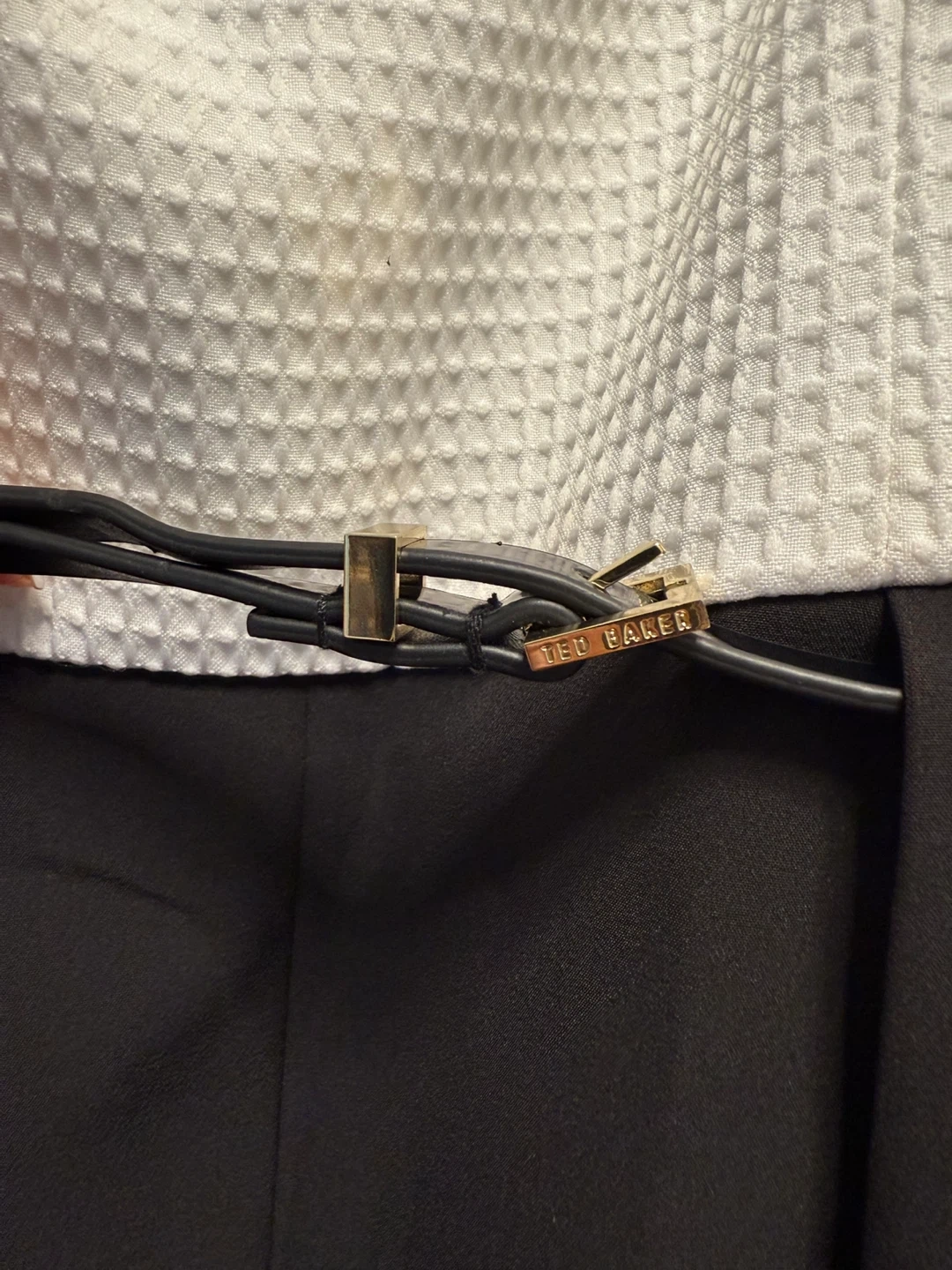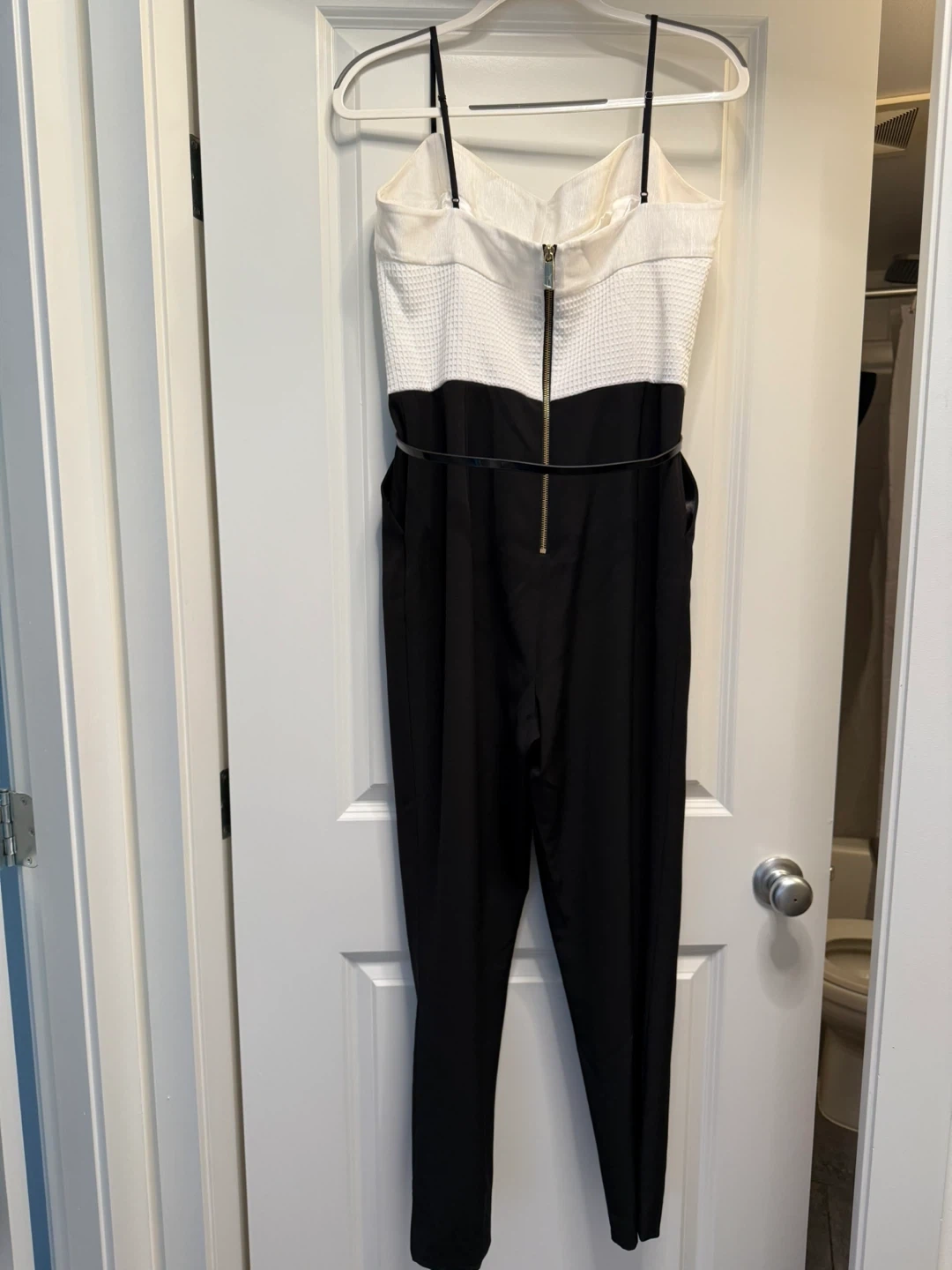 Selling a Ted Baker jumpsuit in a classic black and white colour combination! It features a stylish design that would be great for a night out or a special occasion. The white waffle material and the gold hardware accents makes for a sophisticated look and feel. This piece has only been worn once