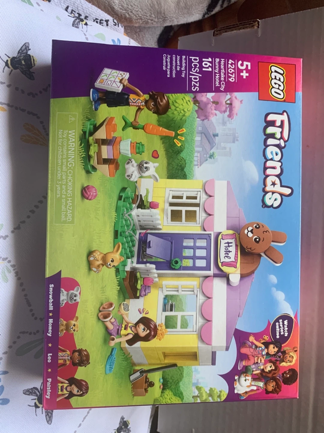 This LEGO Friends set features the Heartlake City Bunny Hotel building toy. It includes 161 pieces for construction. This toy is recommended for ages 5 and up.