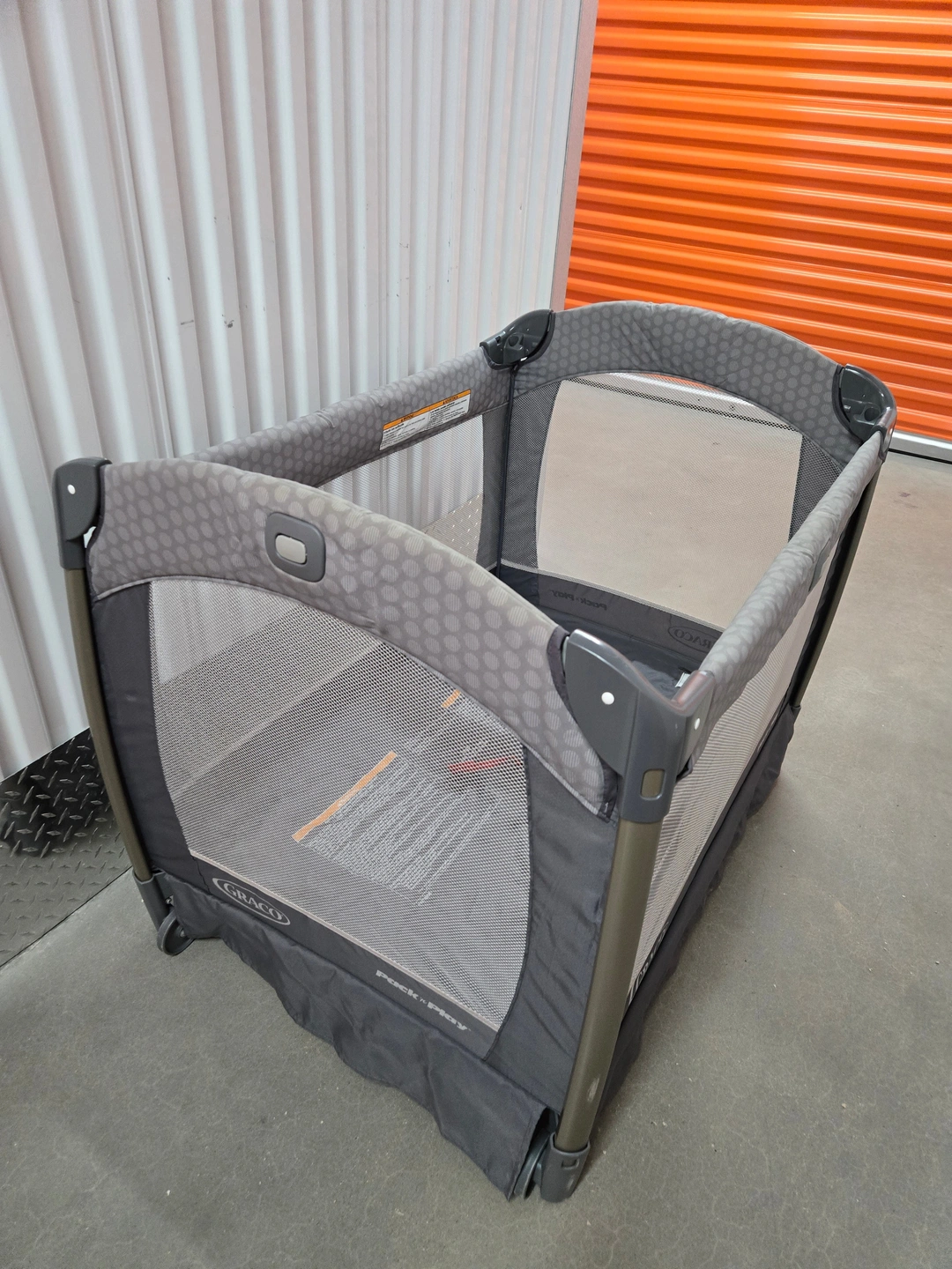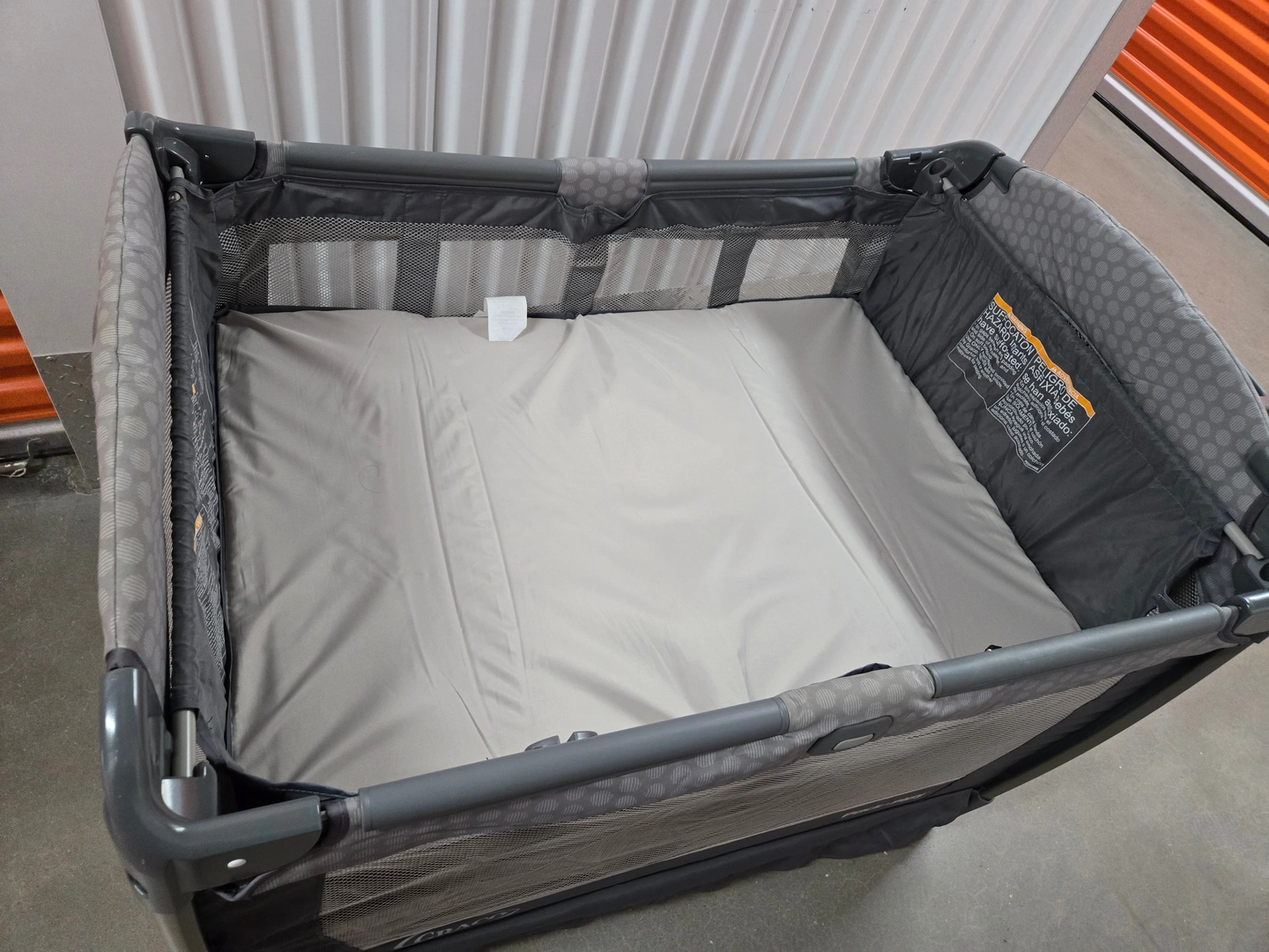 – Portable playard with mesh sides for visibility.