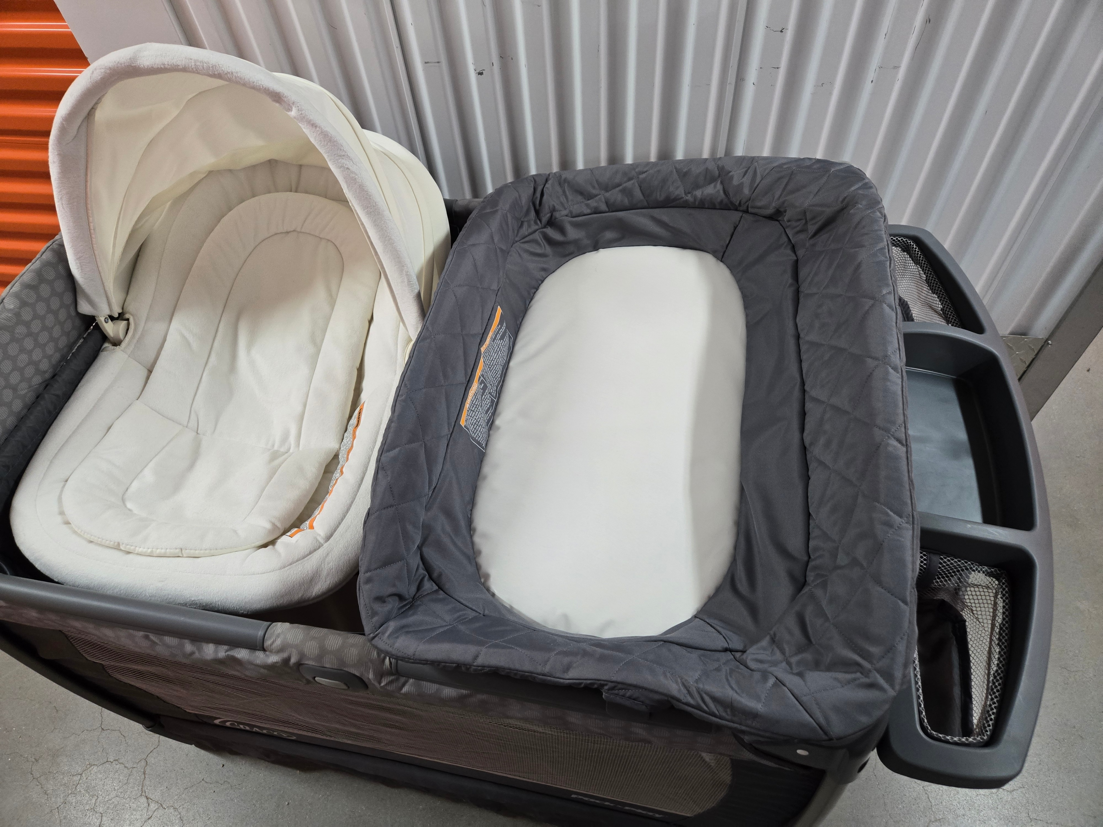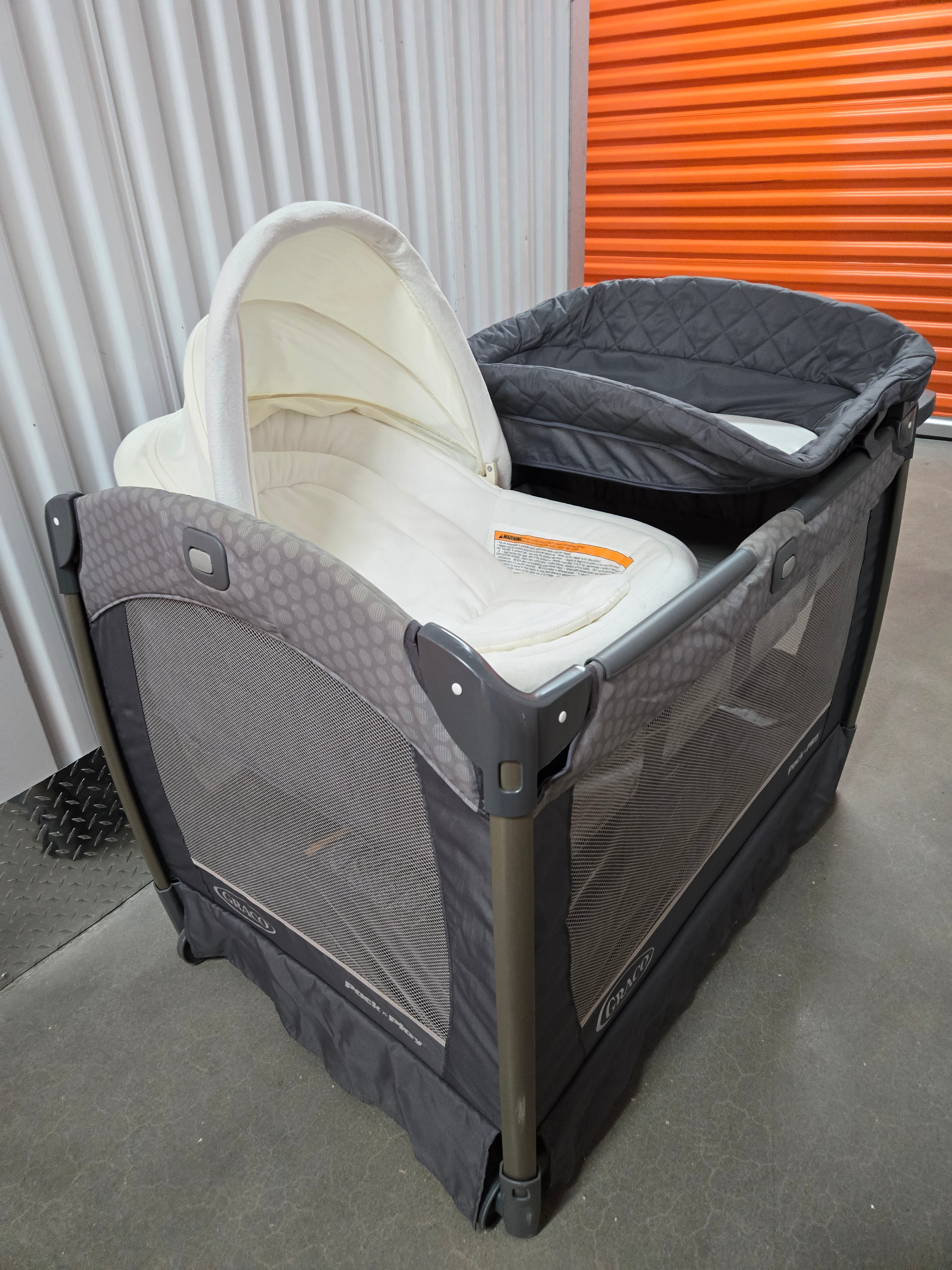 – Portable playard with mesh sides for visibility.