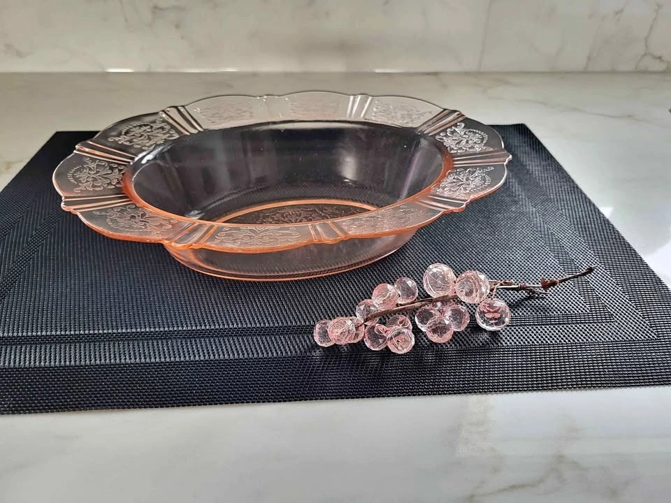 American Sweetheart Pink Depression Glass Oval Etched Wide Rimmed Dish by MacBeth Evans c1930s. Measures 11" L x 8 1/4" W. No cracks, no chips.
