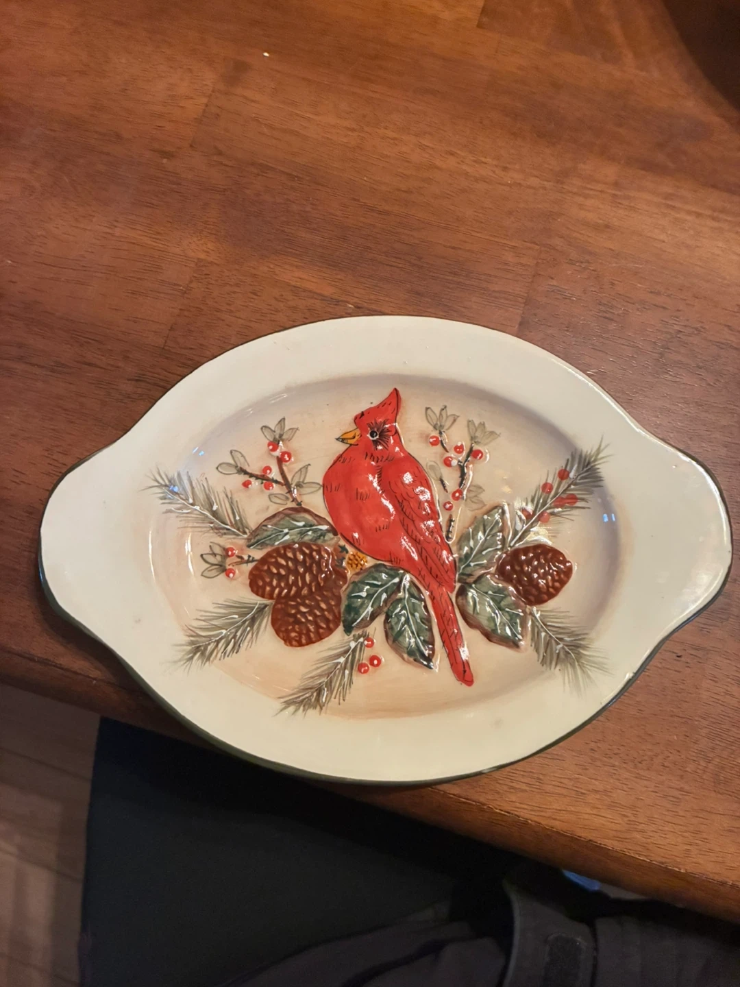 A ceramic serving platter featuring a festive cardinal design with pinecones and berries. It's perfect for holiday gatherings or as a decorative piece. This platter is approximately 12 inches long.