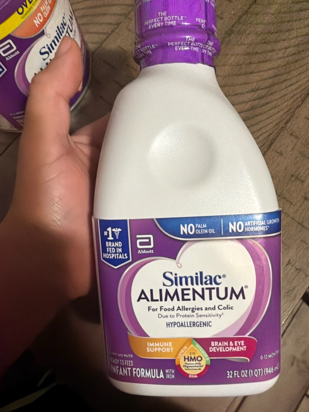 Similac Alimentum infant formula, perfect for babies with food allergies and colic. It's hypoallergenic and designed for protein sensitivity. This formula also supports brain and eye development with HMO and DHA. No palm olein oil or artificial growth hormones.