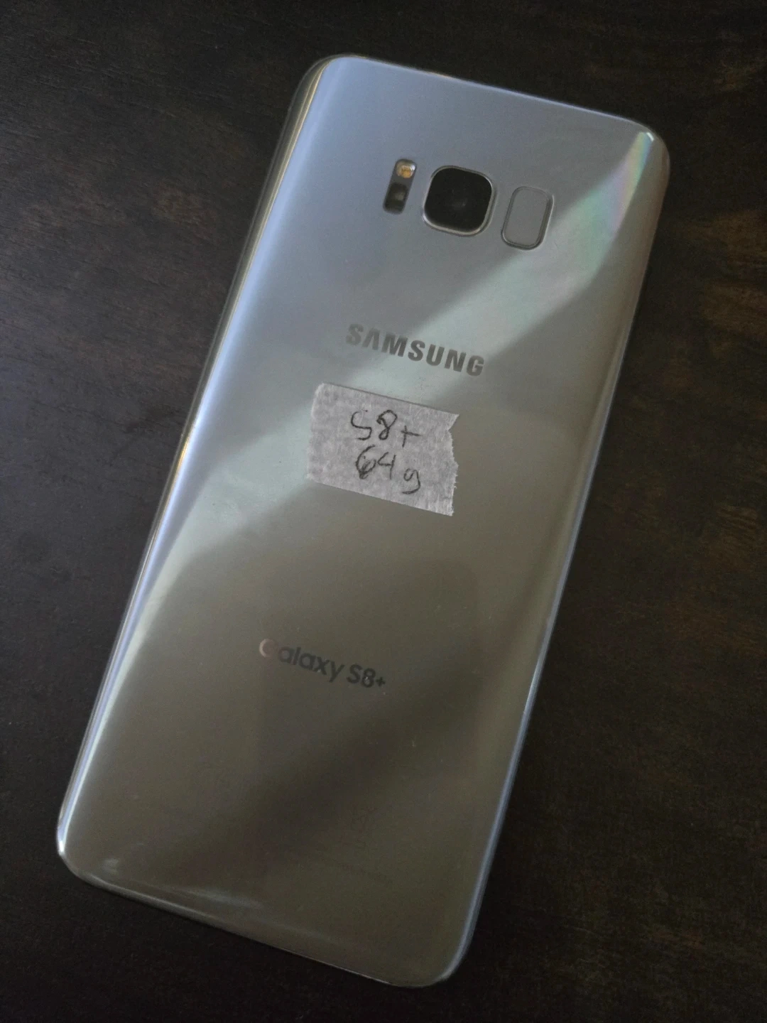 Samsung Galaxy S8+ smartphone with 64GB storage. Silver colour. This phone is unlocked. It has a vibrant display and a good camera.