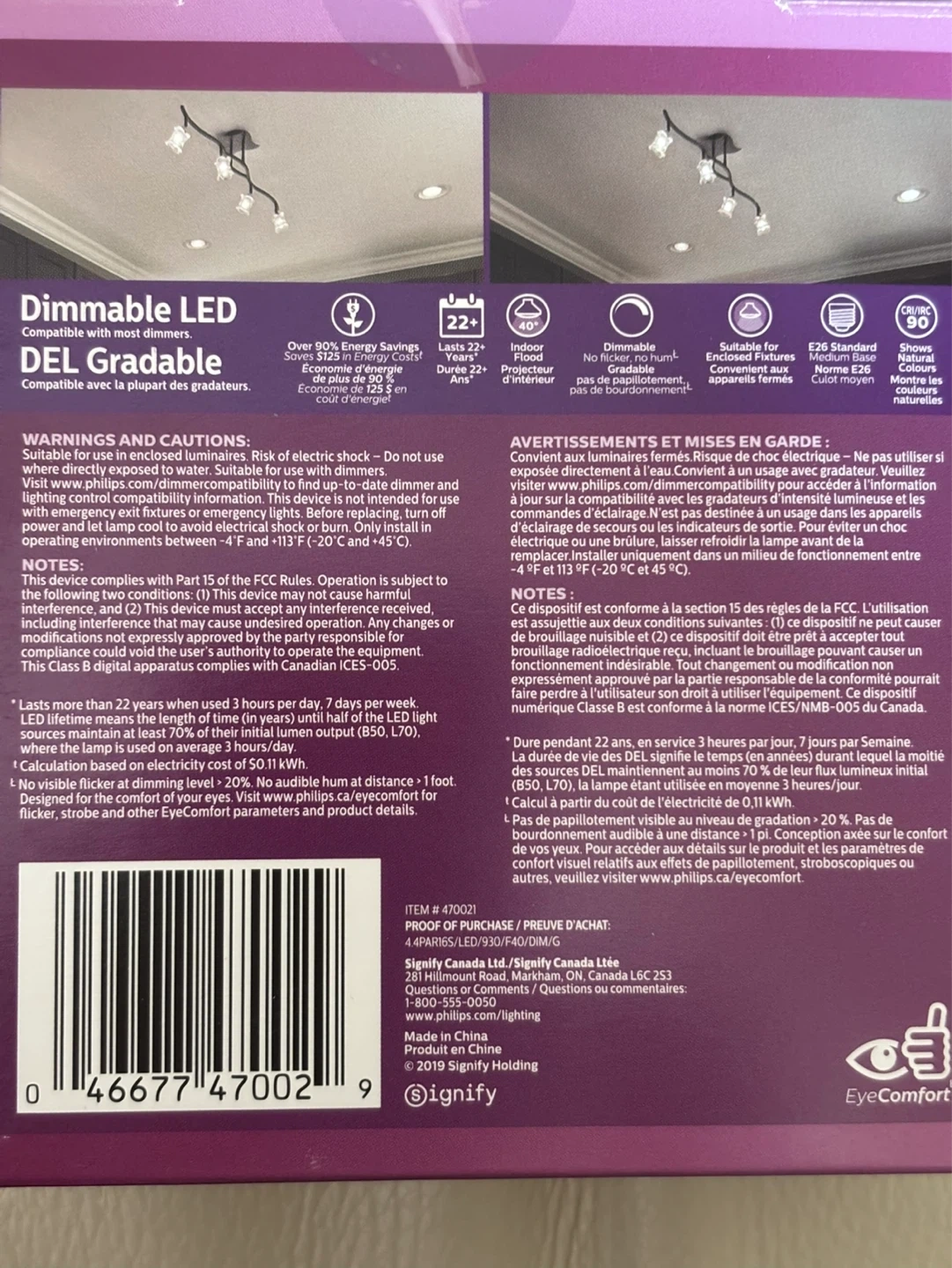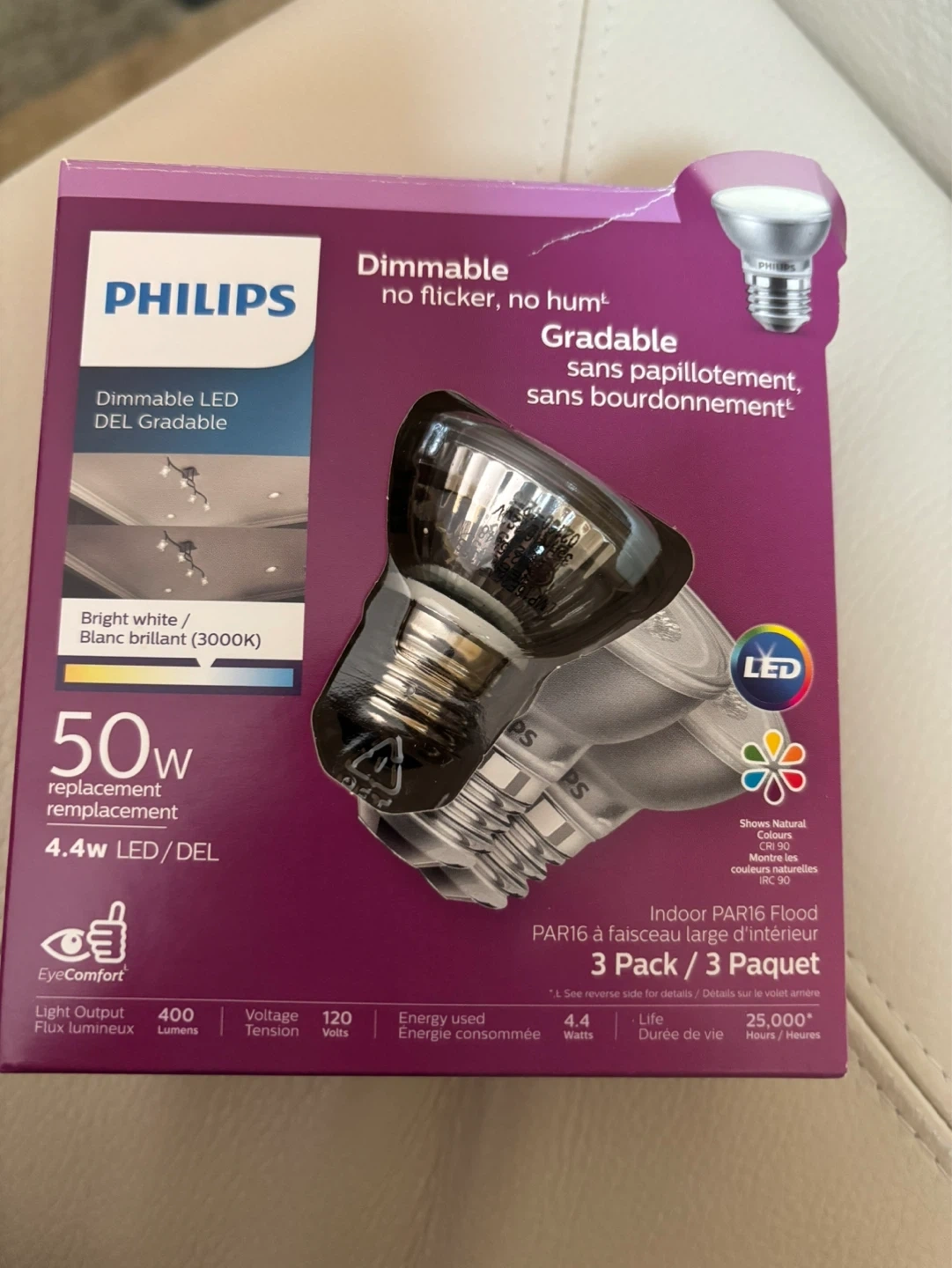 These are Philips Dimmable LED Flood bulbs, perfect for indoor use. They provide bright white light (3000K) and replace 50W incandescent bulbs while only using 4.4W. Designed for 25,000 hours of life and no flicker!