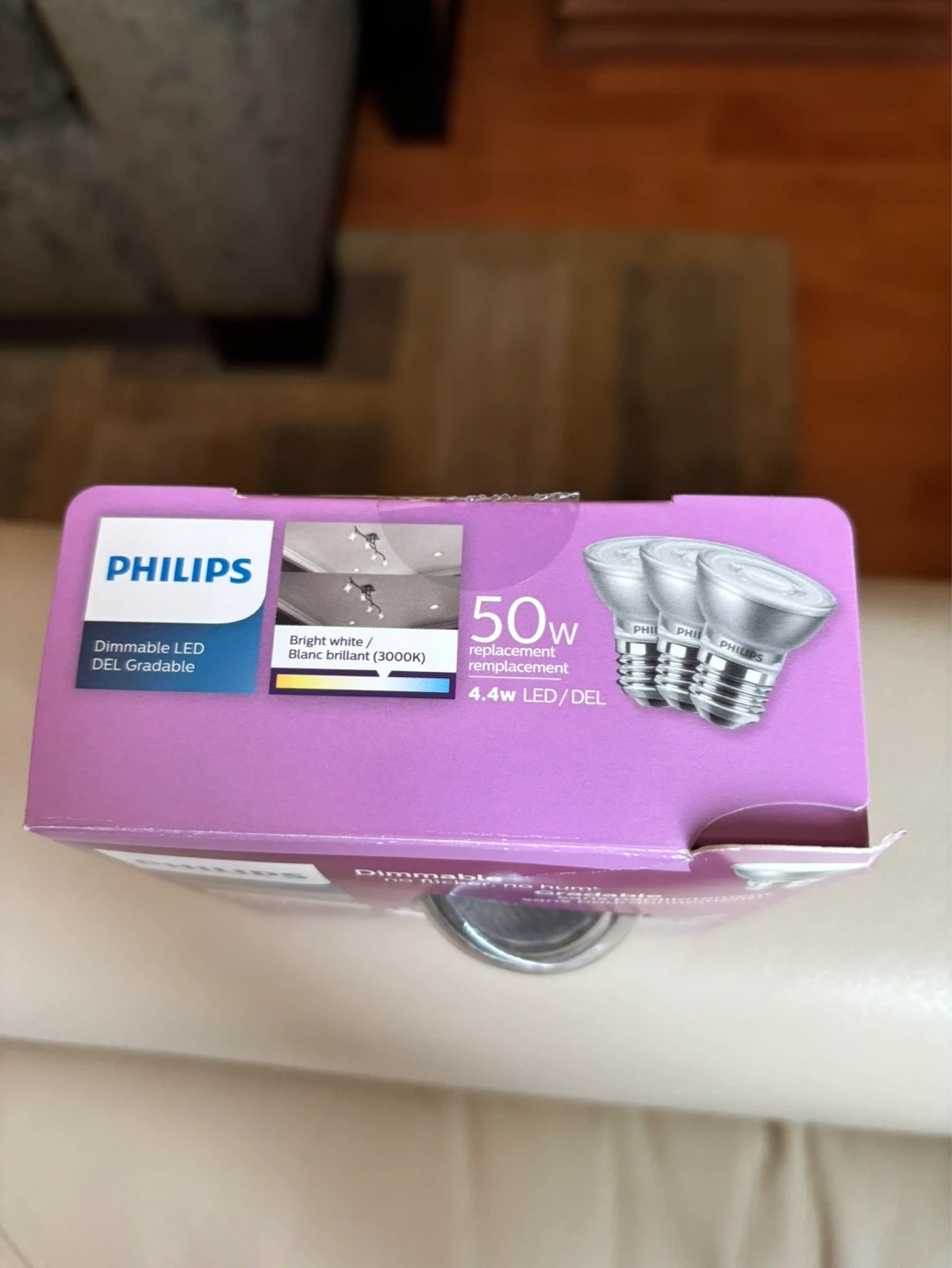 These are Philips Dimmable LED Flood bulbs, perfect for indoor use. They provide bright white light (3000K) and replace 50W incandescent bulbs while only using 4.4W. Designed for 25,000 hours of life and no flicker!