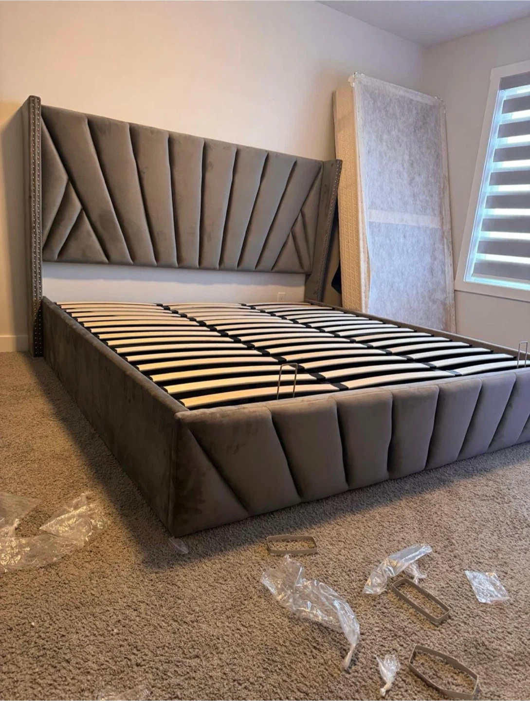 Grey velvet upholstered king bed frame featuring a stylish channel tufted headboard with wingback details and silver nailhead trim. Sturdy wooden slat support system is included for your mattress. Plush fabric and modern design make it a statement piece for any bedroom!