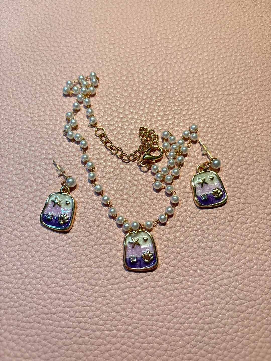 A dainty necklace and matching earrings featuring a pearl chain and square pendants with a purple, gold, and white celestial design. The necklace has an adjustable clasp. Great for adding a touch of whimsy to any outfit!