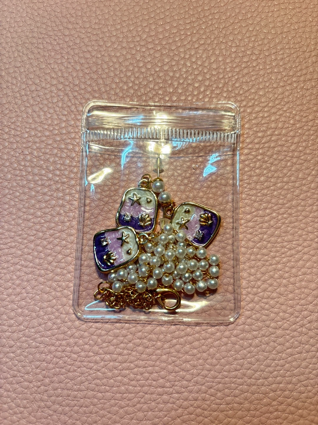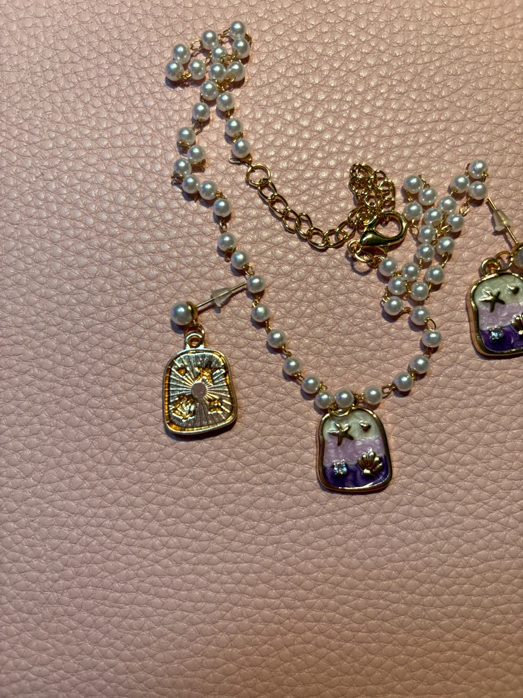 A dainty necklace and matching earrings featuring a pearl chain and square pendants with a purple, gold, and white celestial design. The necklace has an adjustable clasp. Great for adding a touch of whimsy to any outfit!