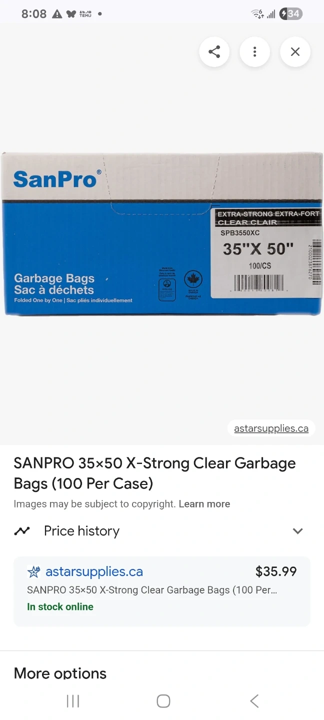 Selling a box of SanPro extra-strong clear garbage bags. The size is 35" x 50". Originally bought for $35.99!