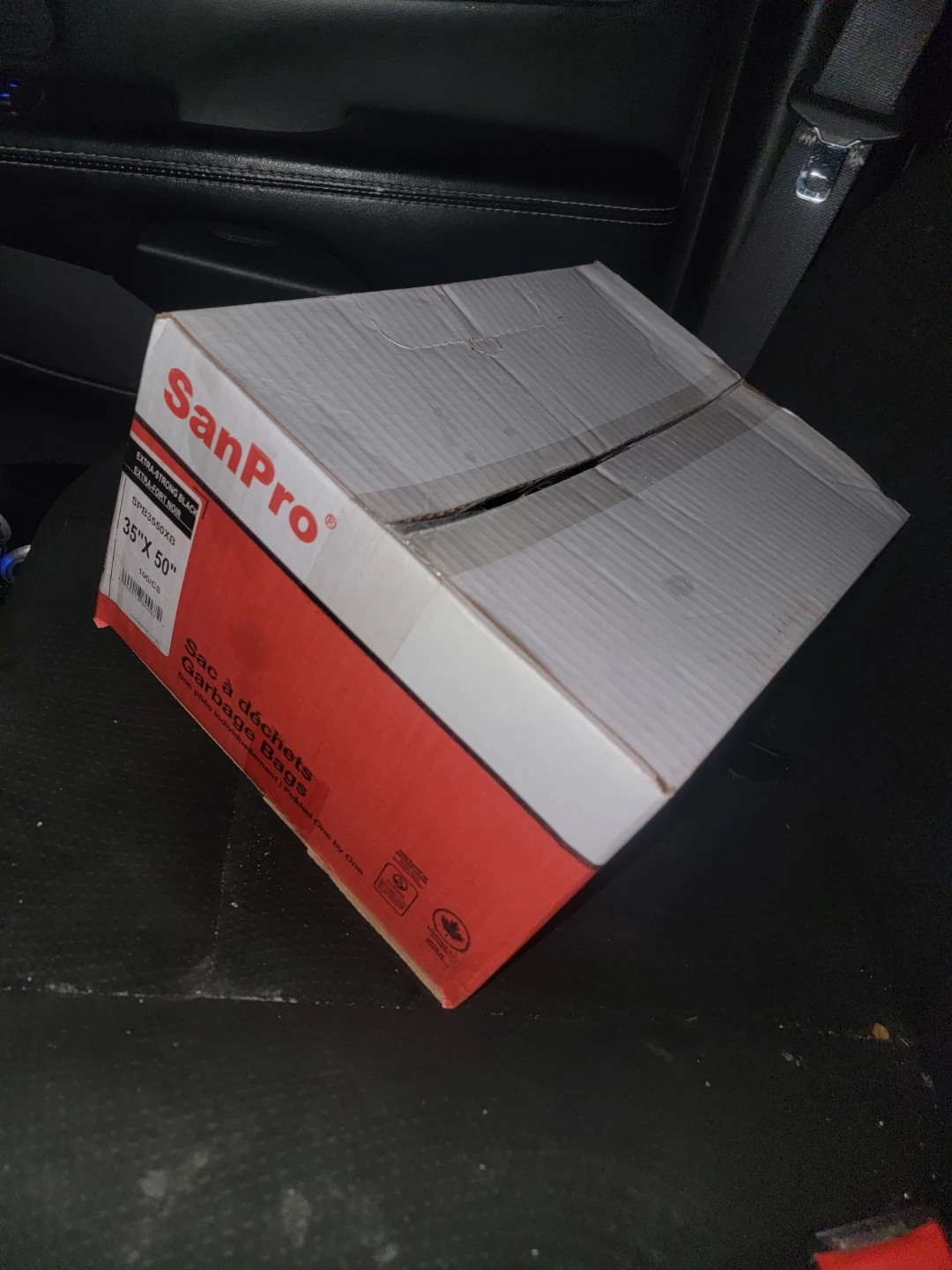 Selling a box of SanPro extra-strong clear garbage bags. The size is 35" x 50". Originally bought for $35.99!