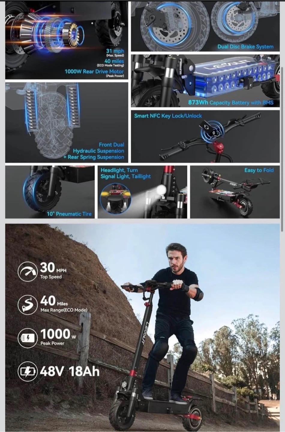 Leoout Electric 1000W Scooter for Adults, Off-Road E Scooter, 54 Km Max Speed, 40-60Miles Range With single charge, 5 Gear Modes, Left and Right Signals, Front and back light.10-11" Tires, Hydraulic Disc Brake, Foldable Commuter & All Terrain Electric Scooters,