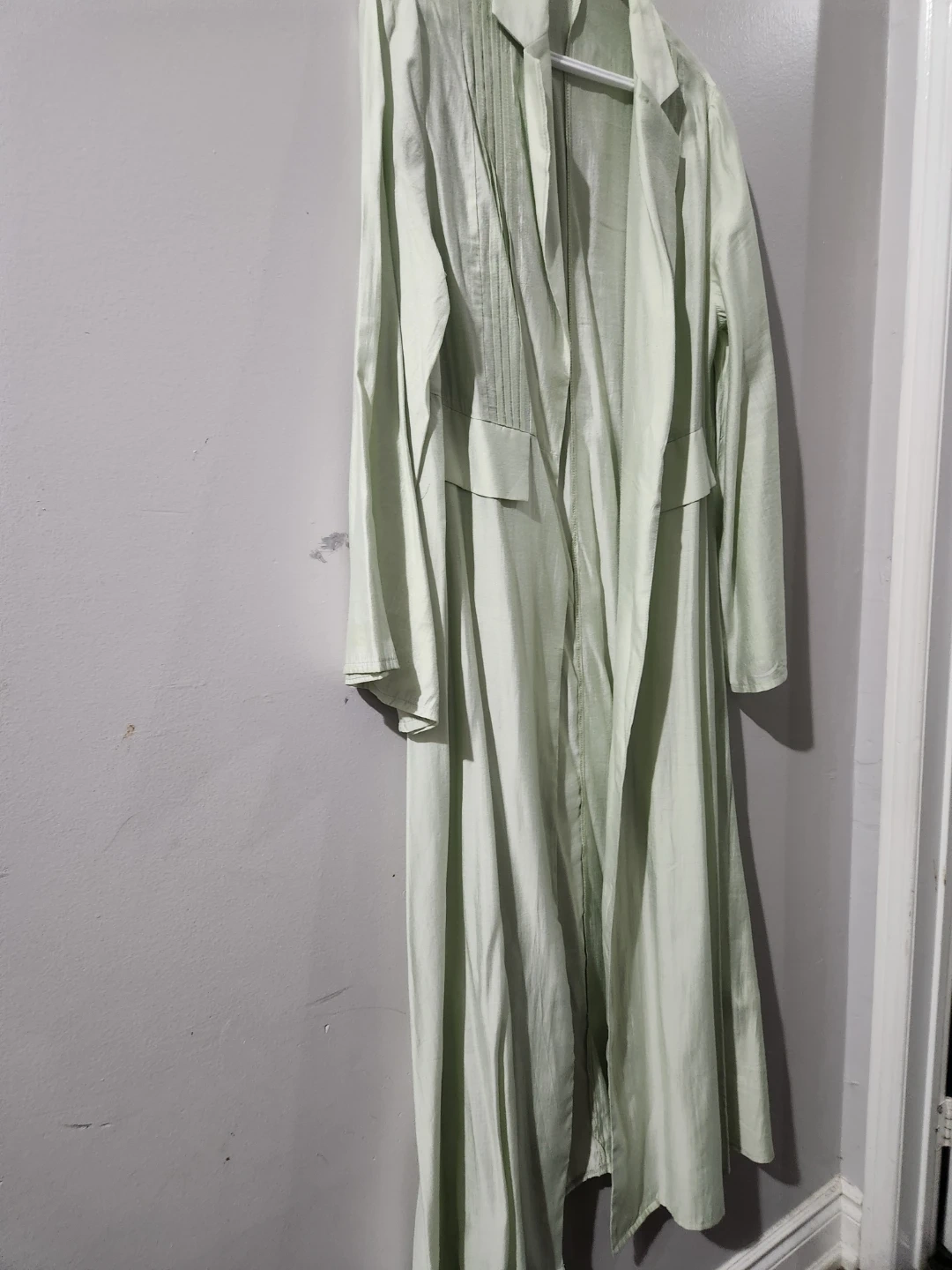 A light green duster jacket with pleated detailing on the front. It has a classic lapel and pockets. This jacket is made of a lightweight fabric, perfect for layering. size large, chest 22 inches, long 52 inches