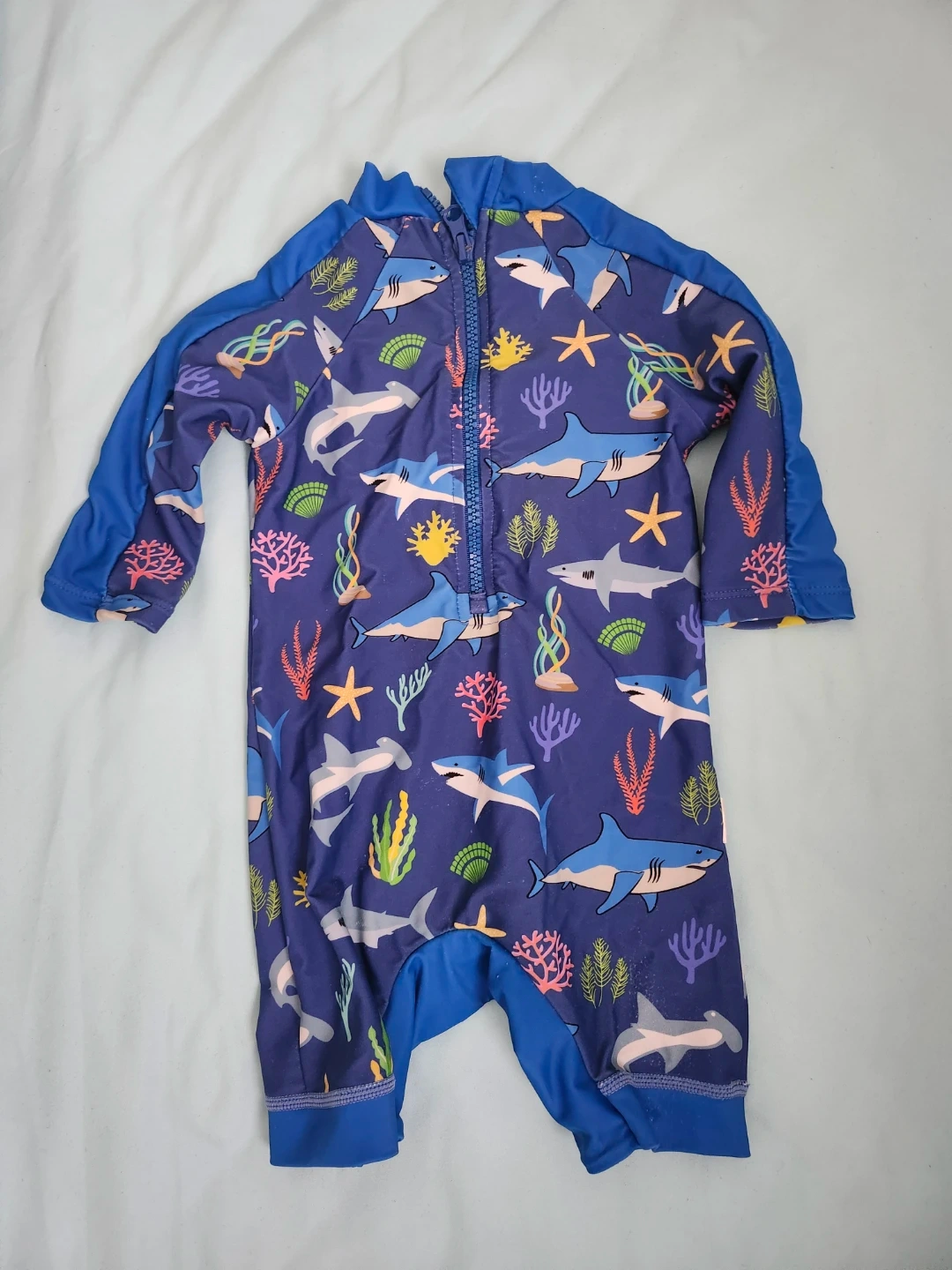 Long sleeve one-piece swimsuit with a fun shark and coral print. Features a front zipper for easy on and off. Perfect for sunny days at the beach or pool!