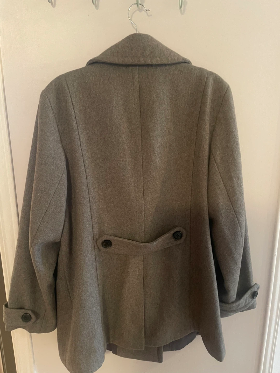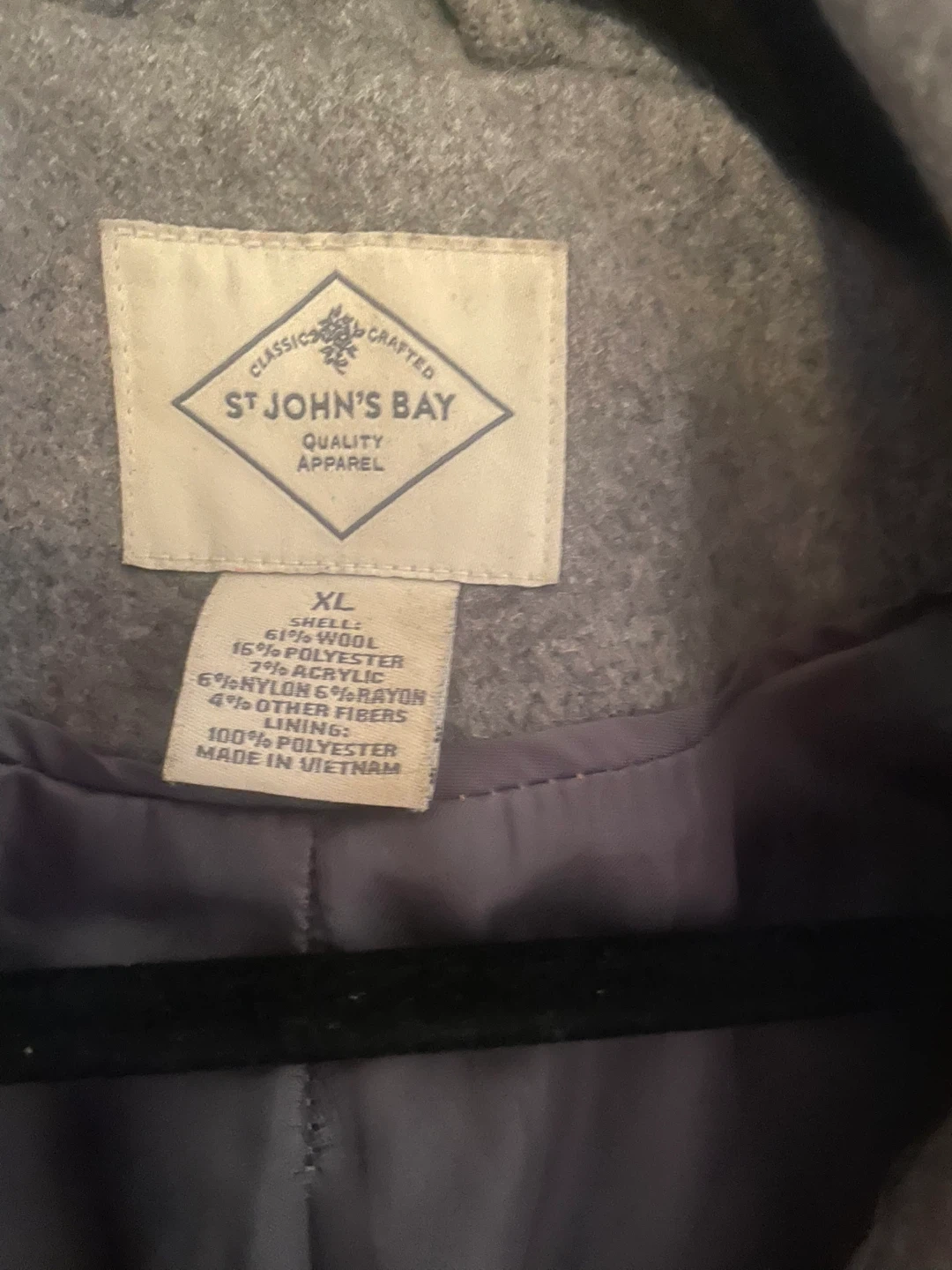 This St. John's Bay peacoat is a stylish and warm option for cooler weather. It's made with a wool blend for comfort and durability. The lining is 100% polyester. This coat is a size XL.