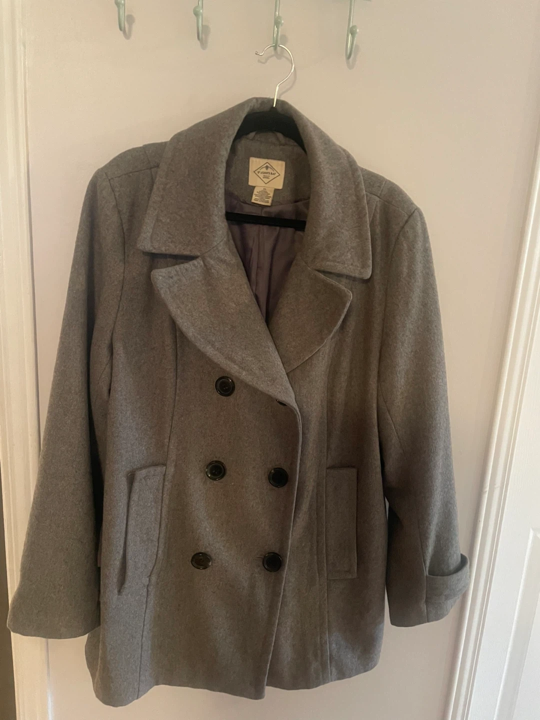 This St. John's Bay peacoat is a stylish and warm option for cooler weather. It's made with a wool blend for comfort and durability. The lining is 100% polyester. This coat is a size XL.
