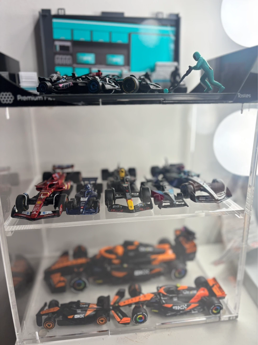 Collection of various Formula 1 diecast model cars. Includes McLaren F1 cars with OKX and Chrome branding. Also features other F1 models and a pit garage diorama with figures. Great for display! Hotwheels , diecast and LEGO
